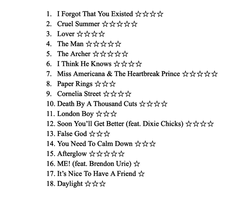 Despite its worldwide success and my self-proclaimed status as a Swiftie, I have some thoughts about her latest project and have rated each song out of five stars at the bottom of this article.