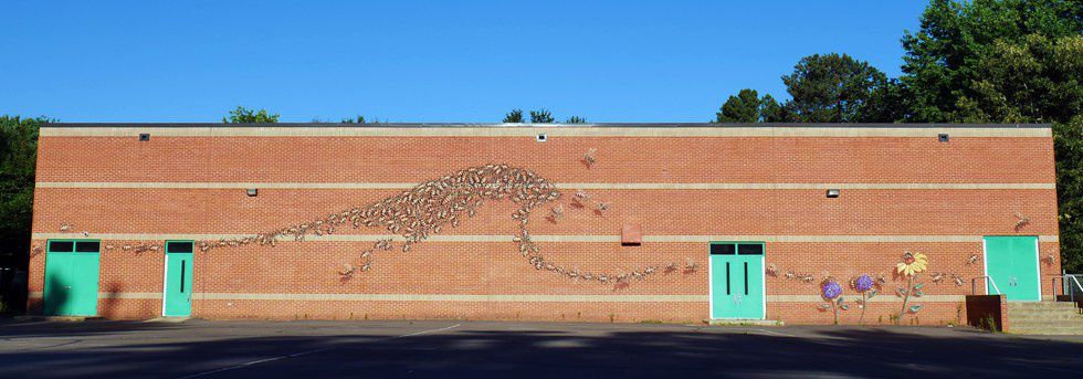 A swarm of bees can be seen flying across the side Estes Hills Elementary School in Chapel Hill, North Carolina. How many bees are on this wall? Try 176. The message that this mural was meant to bring was supposed to inspire the students here, saying that just like bees, we all have a job and a part in all things, no matter how big or small.