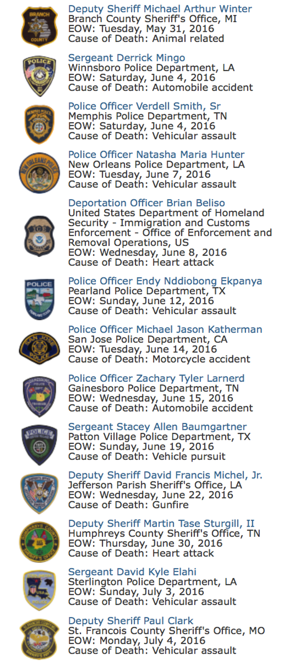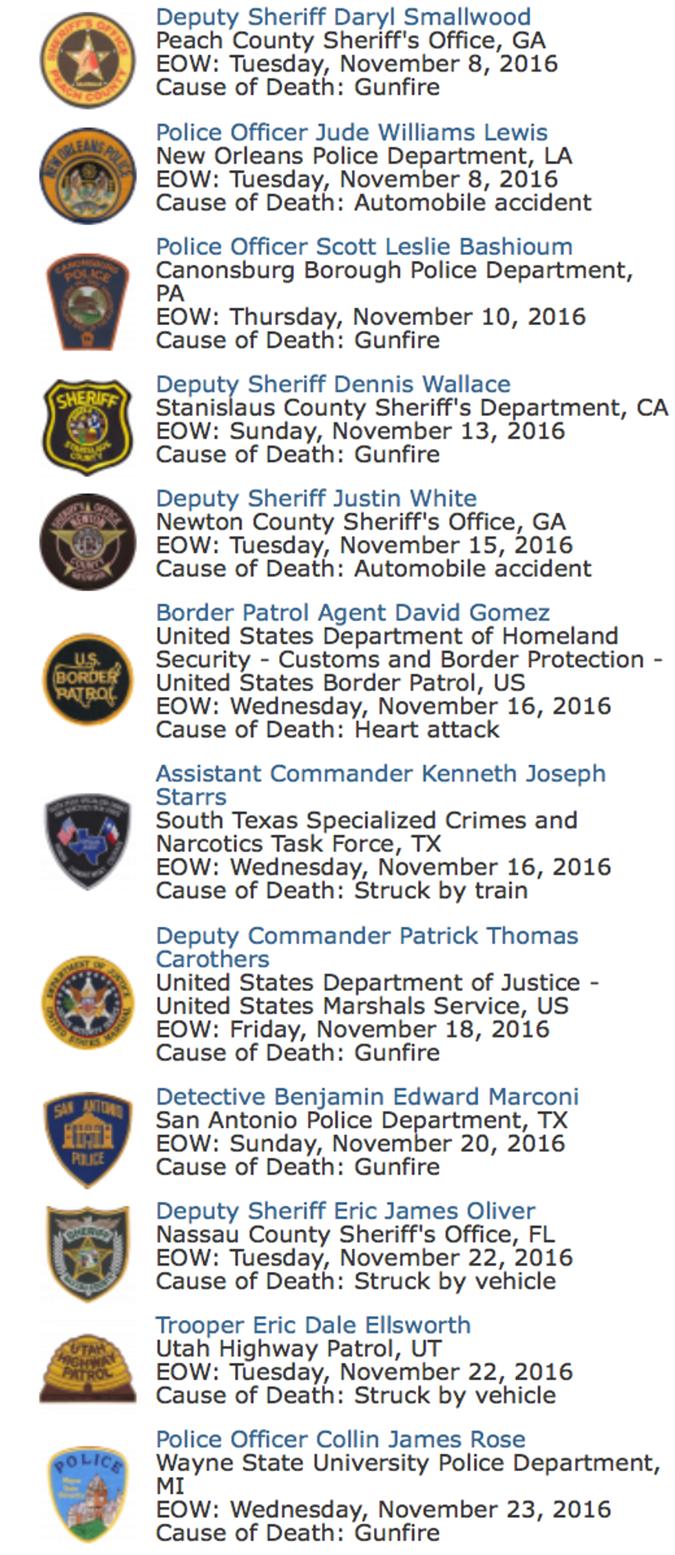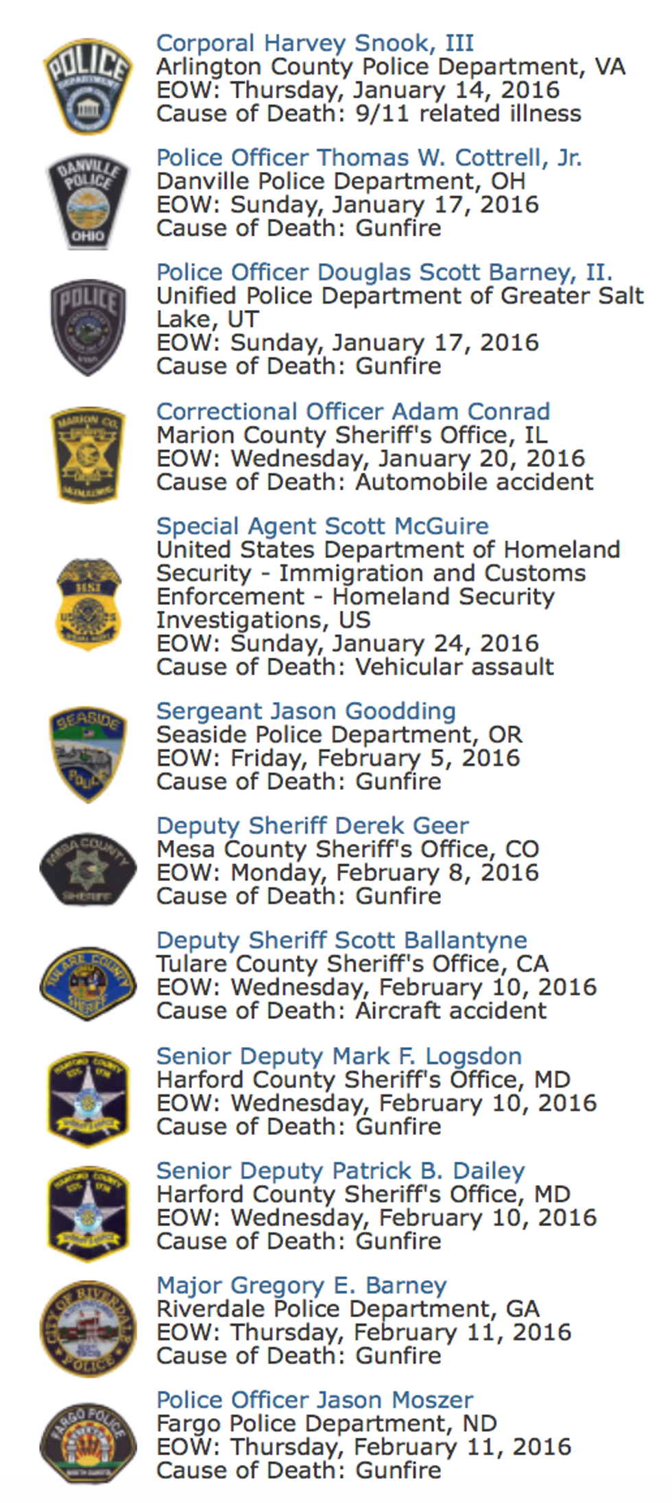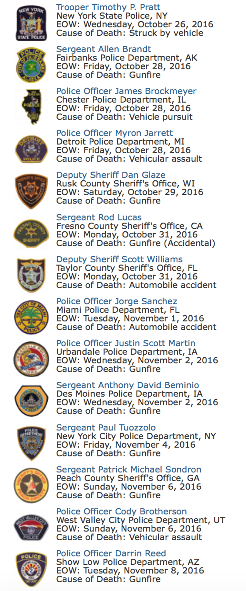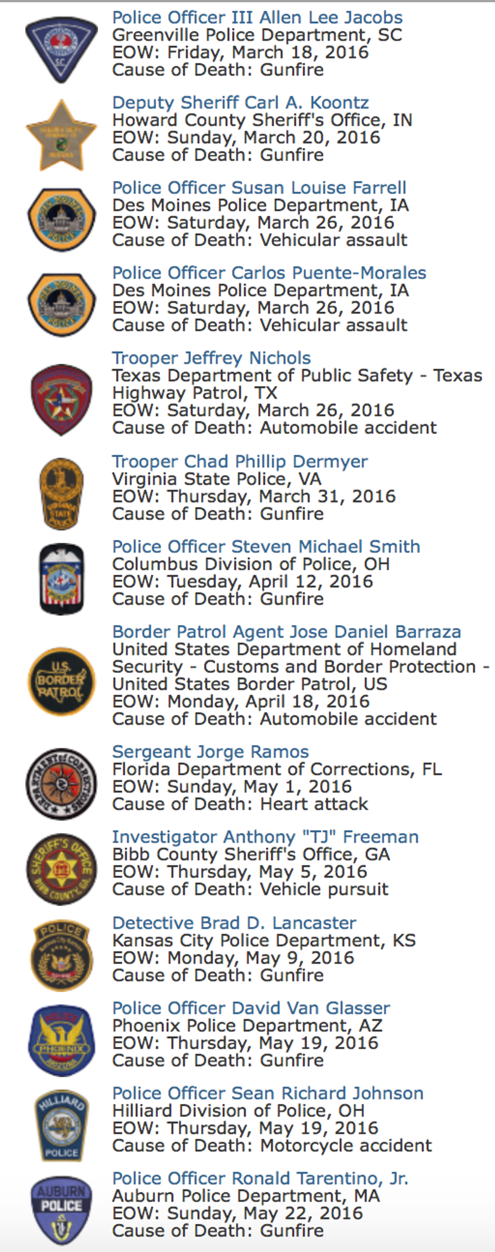 Here are the 136 brave men and women that made the ultimate sacrifice as law enforcement officers. This list is courtesy of the Officer Down Memorial Page, I strongly suggest those reading check it out and consider donating to their cause. https://www.odmp.org