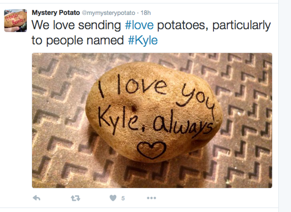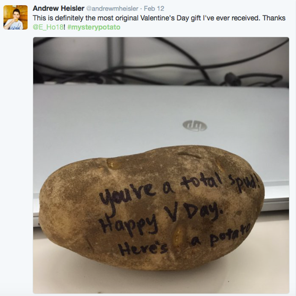 The picture came from an account called "Mystery Potato" that shows multiple pictures and tweets including a potato with a sharpie-written message across it. I usually come across many dumb accounts on Twitter and thought this was just another parody account, but once again, I was wrong. Messages written on these potatoes are actually sent to real life people. Along with the Twitter account, there is a website, Mysterypotato.com, that allows people to buy and personalize a potato and anonymously send it to anyone of your choosing. People have recently received them as legitimate gifts for Christmas and even Valentines day.