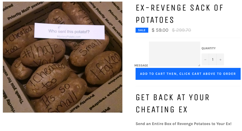 The bundle includes a sack of potatoes with messages that include anything terrible you'd like written to your ex-girlfriend and/or boyfriend. I don't know about you, but if I were trying to get revenge on my ex-boyfriend, sending a sac of potatoes wouldn't be my first choice, but hey, that's just me.
