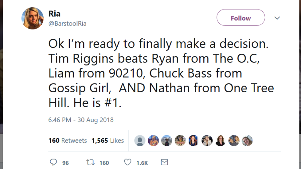 Ria was 100 percent correct when she crowned Tim Riggins as number one. I am literally so in love with his character it hurts. Not only is he pretty, but for some reason my type is "asshole football player" and he fits the bill. Through character development he comes a long way and ends up being even more attractive. What I would do to get a beer with Rigs.