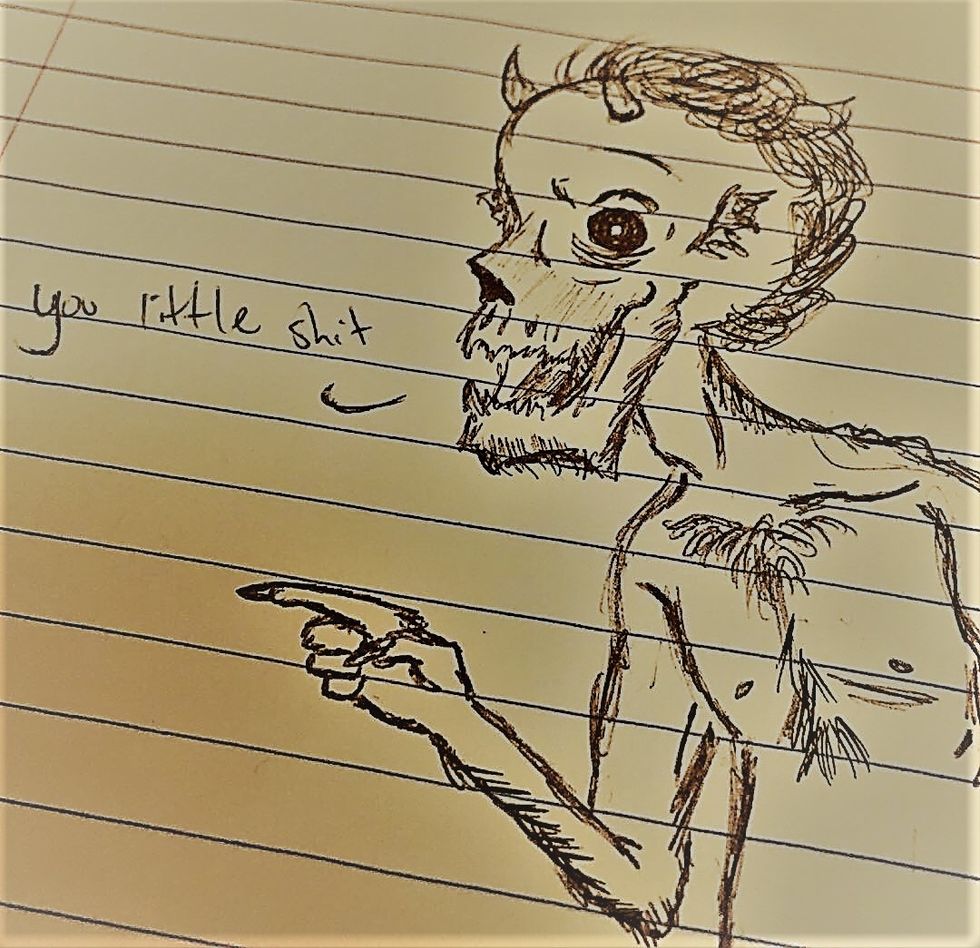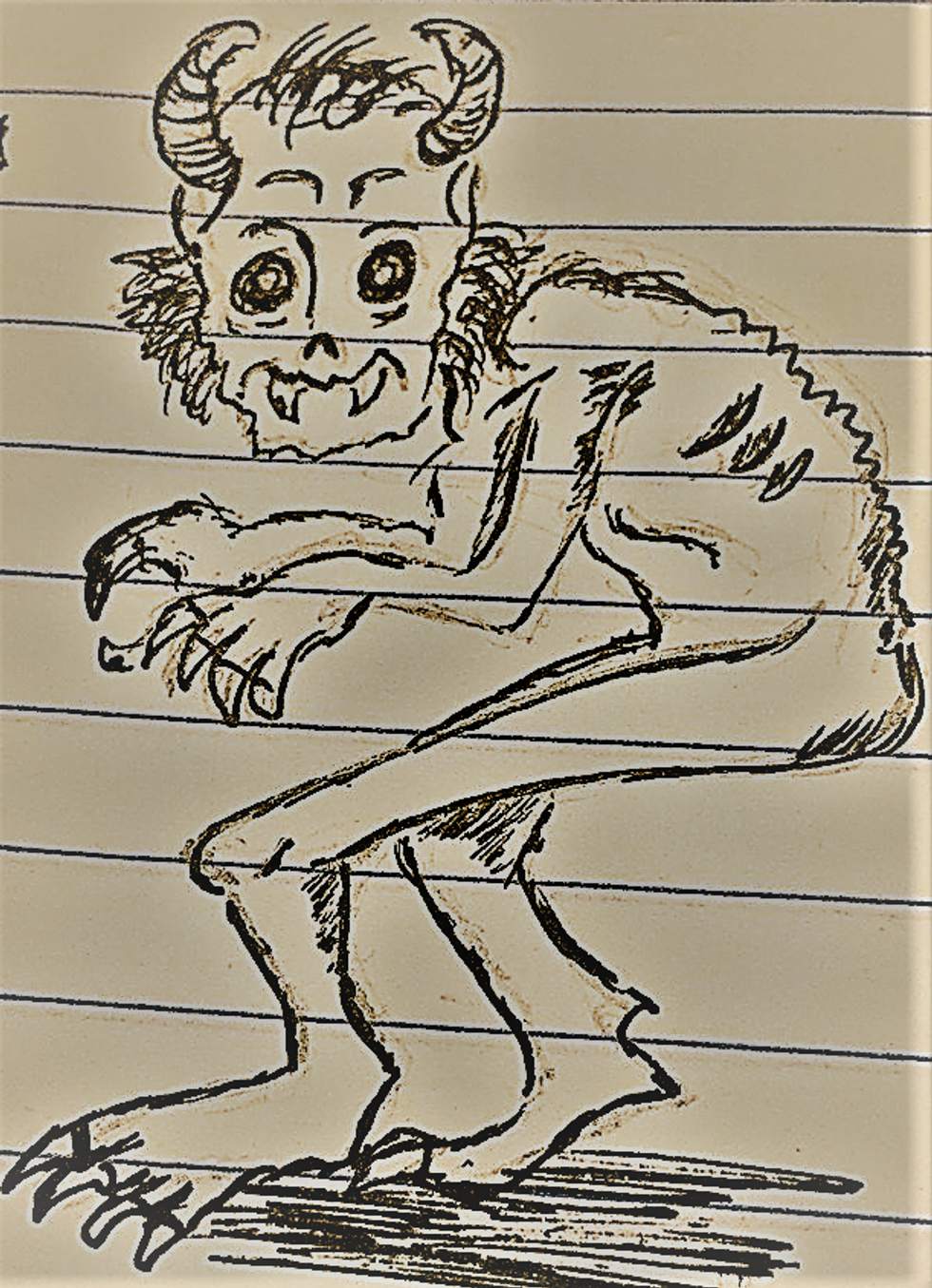 This huge six-foot creature that looked like some kind of demon. With its skull-faced features, gray skin with scraggly hair, and almost naked. It standing on my bed while eating a bag of chips I've left on my nightstand, with its long fingers. I was horrified, and all I could do was ask, "What are you?"