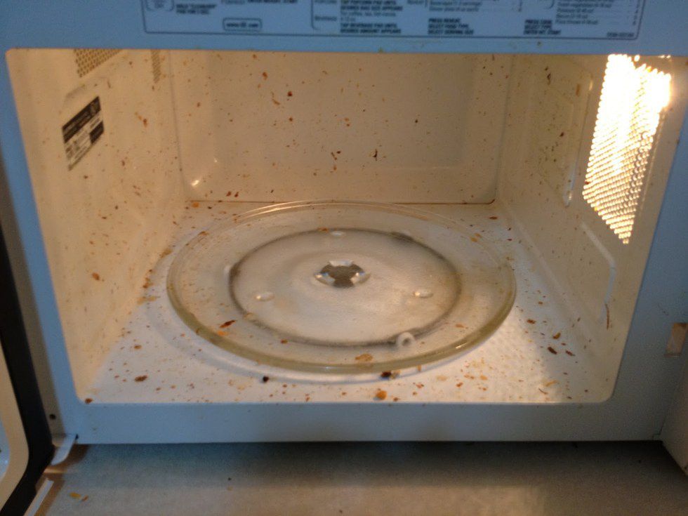 This is just plain disgusting. We always check to make sure the microwave is spotless, and usually it's just a few splatters. However, every once in a while, there is food all over the microwave which turns a microwave cleaning from a 30-second cleaning into a five-minute cleaning. Please be mindful of the way you heat your food so a simple task doesn't have to turn into a long and drawn out one.