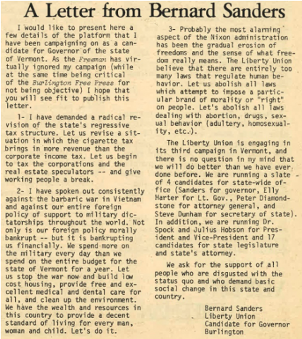 A letter from Bernie Sanders in early 1970's when he was a candidate for Governor of Vermont.