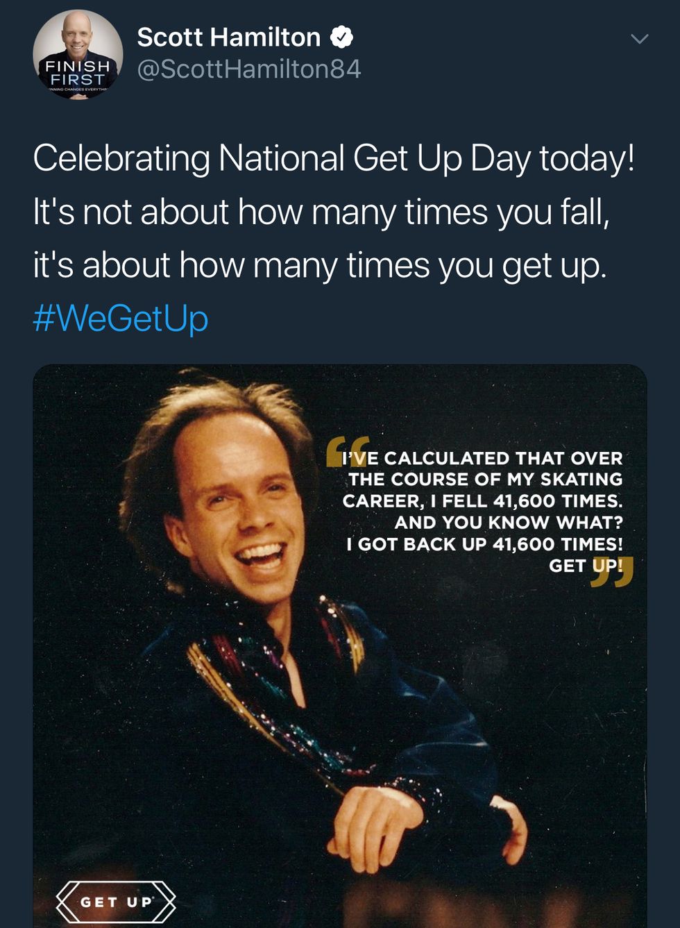 Scott Hamilton, an Olympic gold medalist and four time U.S. Champion, also tweeted with the hashtag #WeGetUp. He emphasizes that it doesn't matter how many times you fall, what matters is that you persevere and get up to try again. It's not about falling, but what you learn from it.