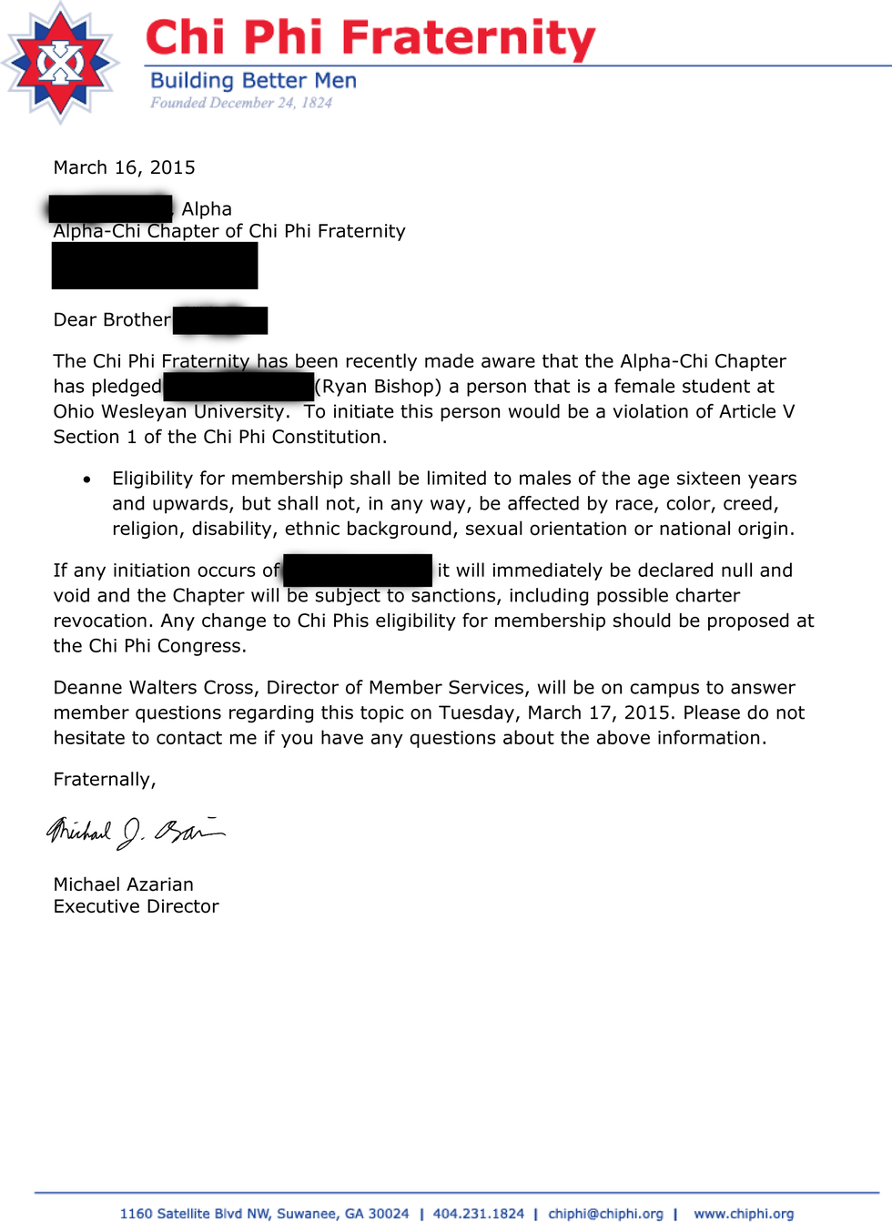 Below is a copy of the letter sent from the Chi Phi national office to the Alpha-Chi Chapter of Chi Phi barring Ryan Bishop's acceptance into the fraternity.