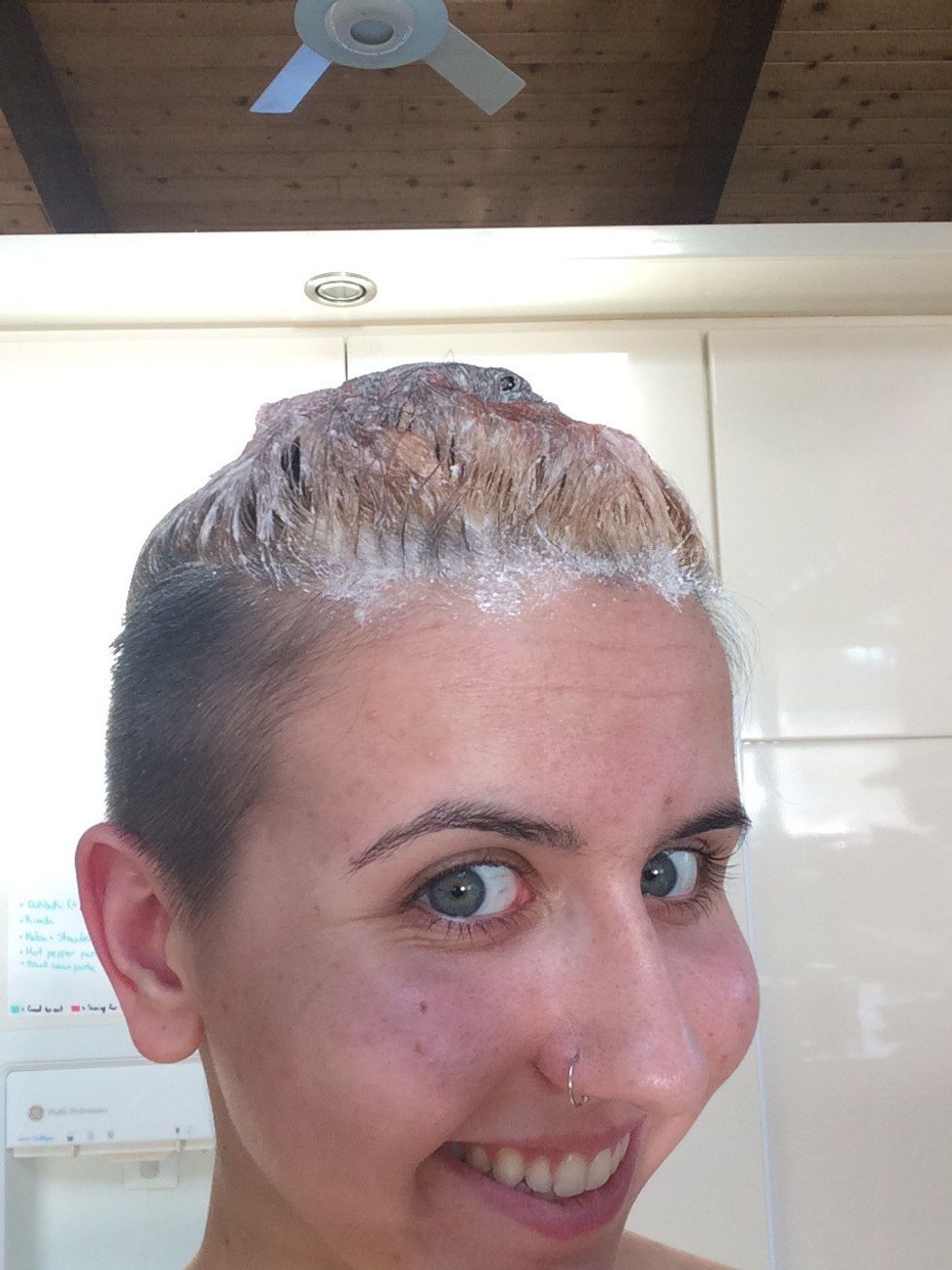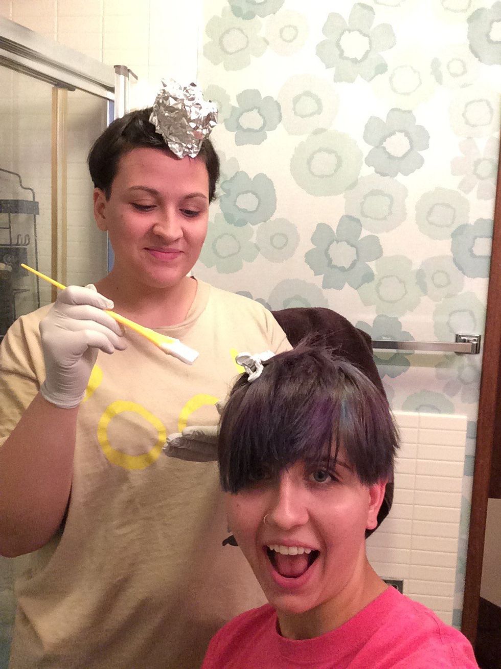 If you do decide to dye your whole head a different color, then be prepared to manage your roots. That is my friend applying bleach to my hair while the bleach I applied to hers is processing.