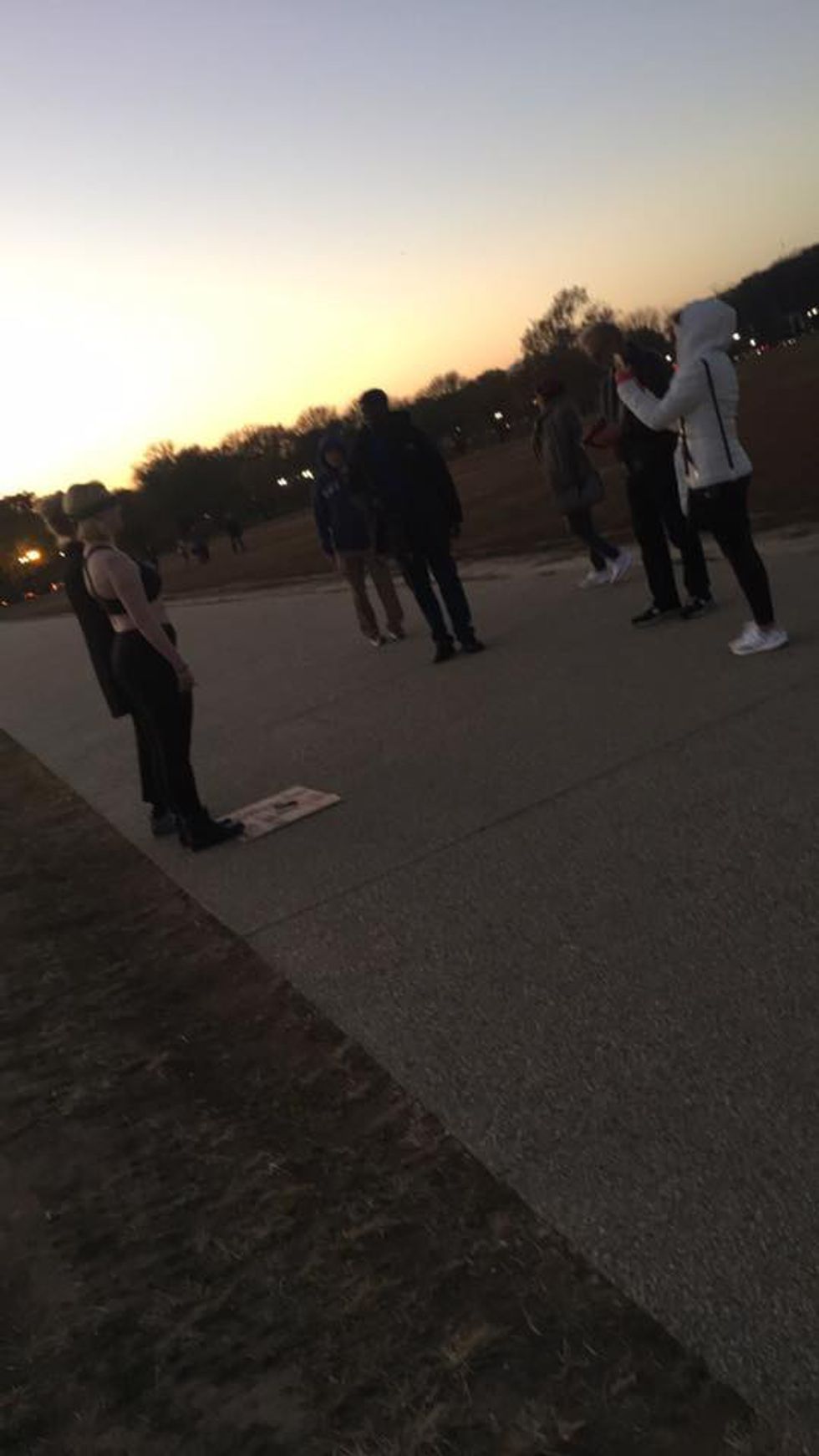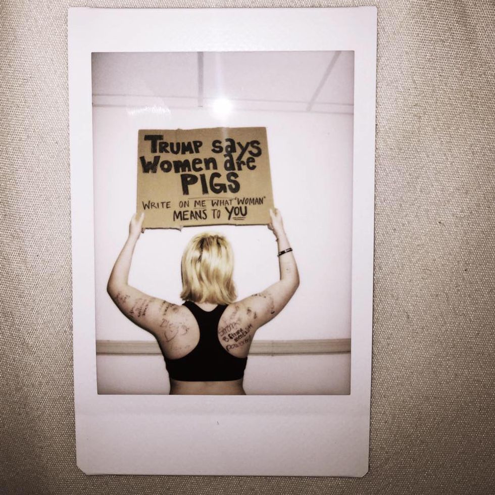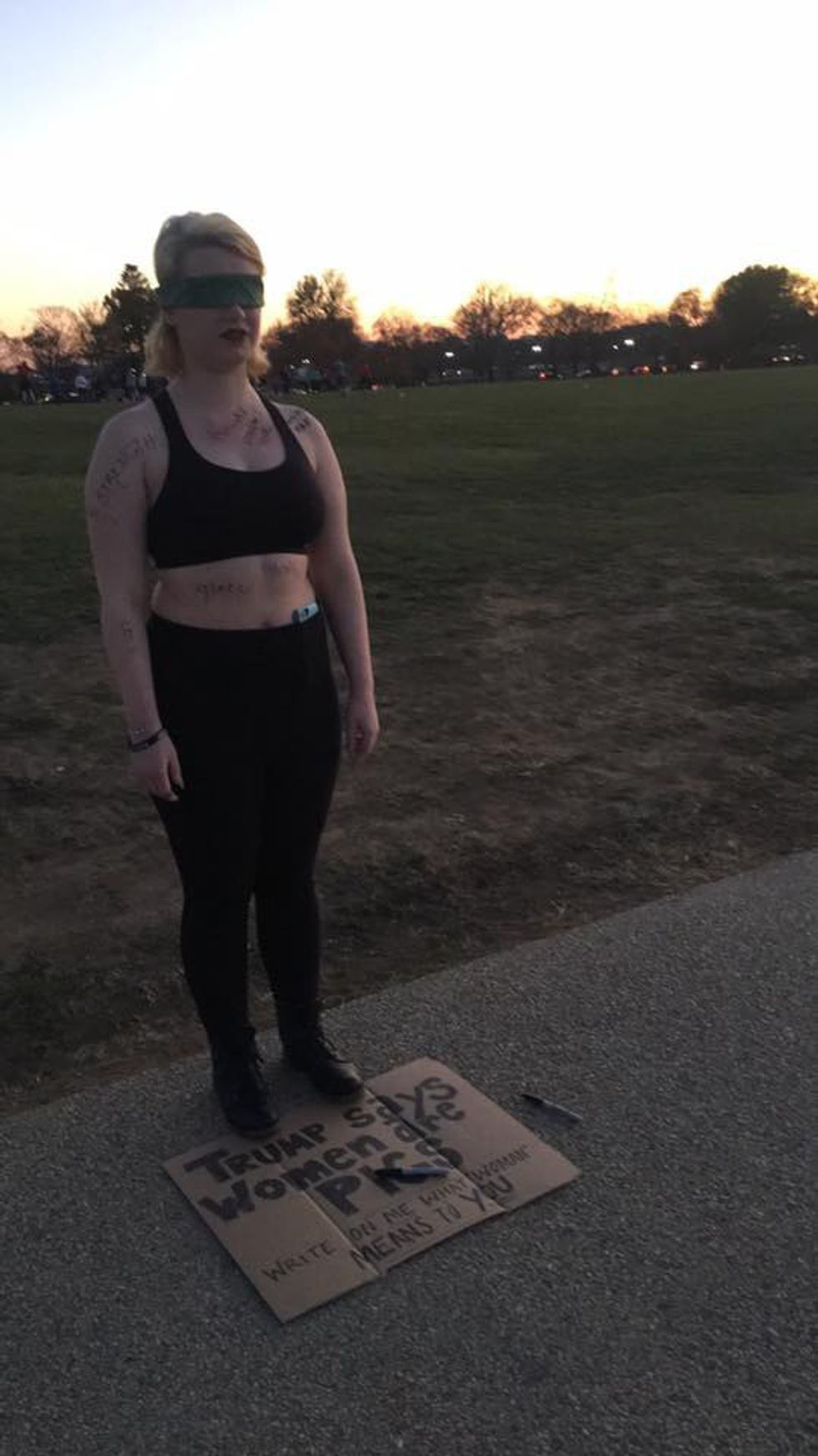 But for some reason I didn't want to hold a sign and shout at large crowds of people, no matter how moved I am by those who do just that. I wanted people to listen to me without me really having to say anything. So yesterday, I stood outside the Washington Monument, shirtless and blindfolded, two sharpies in hand, and a cardboard sign at my feet that read "Trump says women are pigs. Write on me what "woman" means to you." Now this was more of an experiment than a protest. I wanted to make myself as vulnerable as possible so as to not have an effect on what people wrote on me, and to see how they would react to this half naked white girl standing in the cold outside a national landmark.