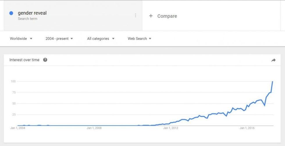 Google Trends is easily one of the best places online to spot rising trends. Prior to June 2010, the term "gender reveal parties" had a search of 0, but around early 2011 the search for gender reveal parties really spiked. The next big peak was in May 2015, and in May 2017 searches for gender reveal parties was at the highest it had ever been.