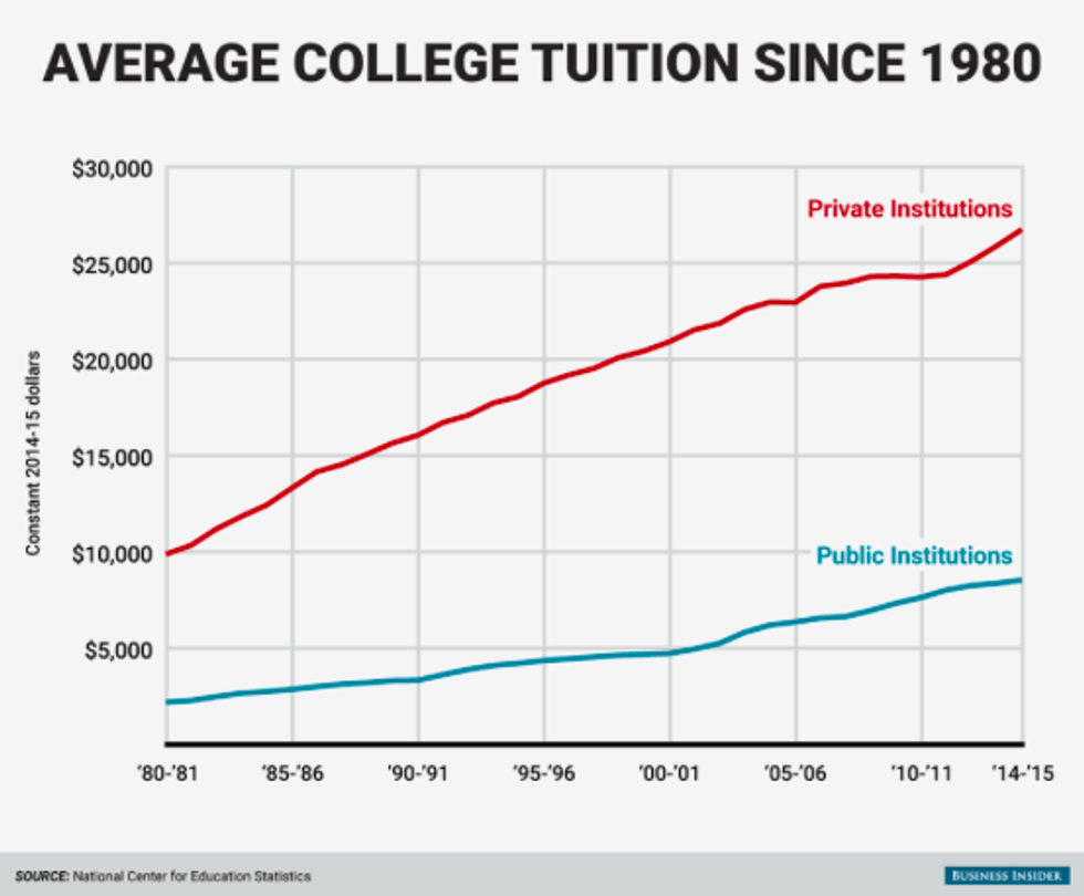 During the 1980-81 school year, the average college tuition at private universities was $9,882. By 2014-15, that number exploded to $26,740.