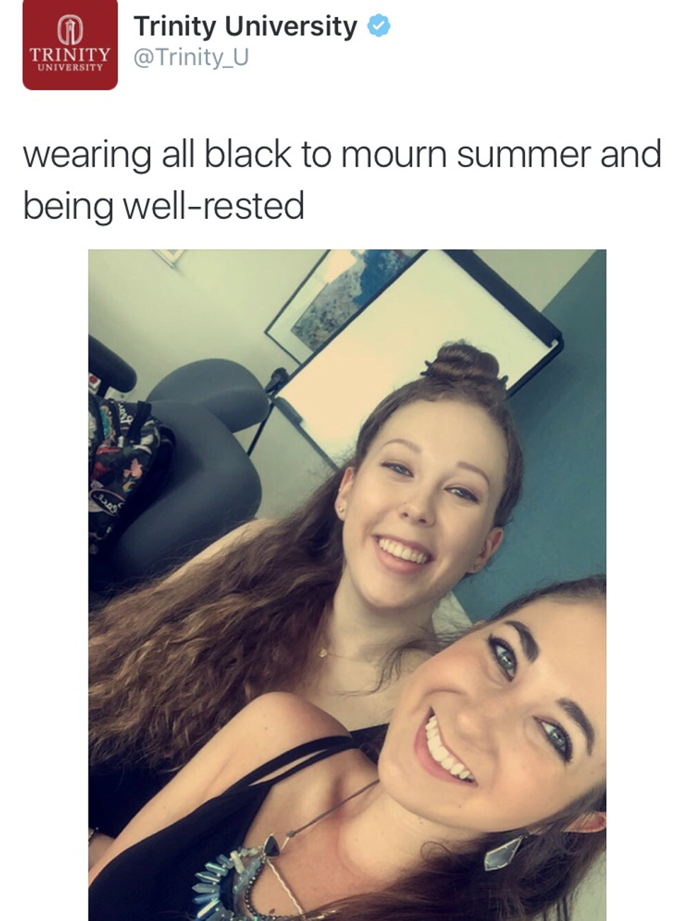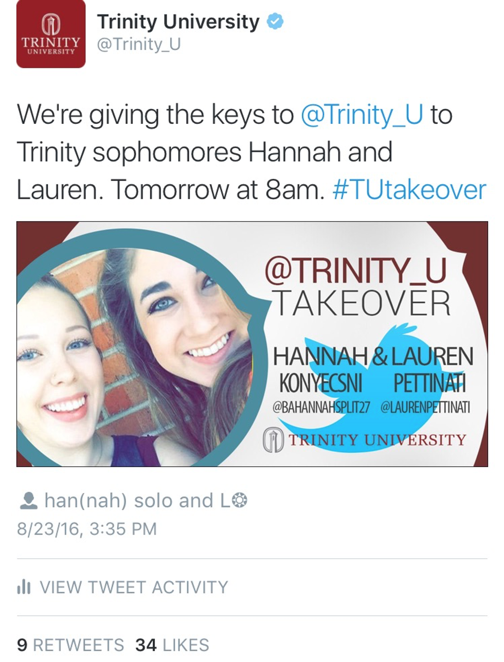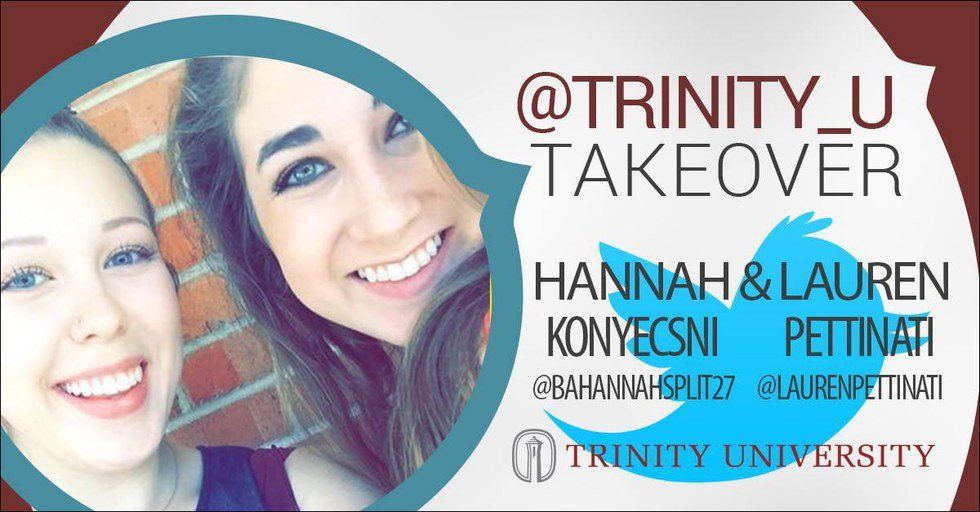 After stalking my extremely hilarious Twitter (at least that’s what everyone tells me), Taylor from Trinity’s Marketing Department direct messaged me asking if I wanted to take over Trinity’s account. I’ll let you know that I was completely taken aback by this question. Why me??? Apparently a tweet that I posted months ago solidified their choice. They needed my personality to be the voice of the university. Once they found out that Lauren and I are connected at the hip, suddenly we were the Twitter Takeover Twins.