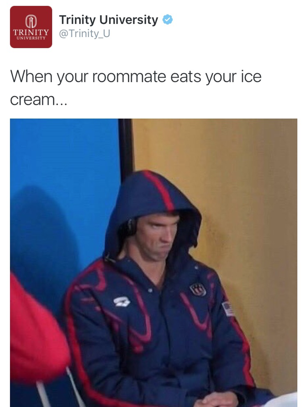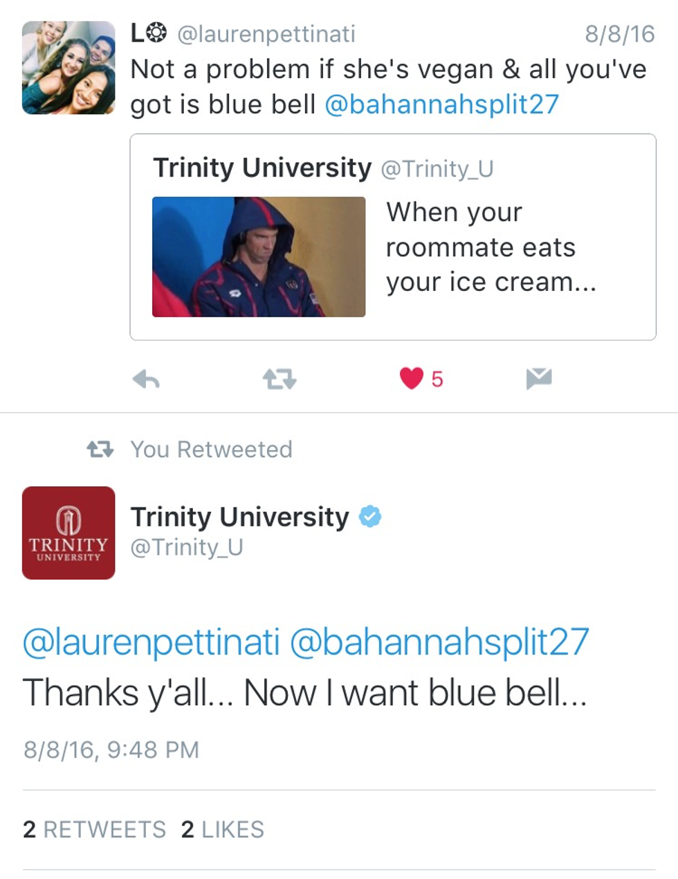 On August 8th, Trinity tweeted a pic of a sad Michael Phelps with the caption “when your roommate eats your ice cream…” Of course Lauren, my stark opposite, had to make fun of the fact that I was once vegan by quoting the tweet with “not a problem if she’s vegan & all you’ve got is Bluebell.” And that folks was the start of it all. We quickly had Trinity’s attention.