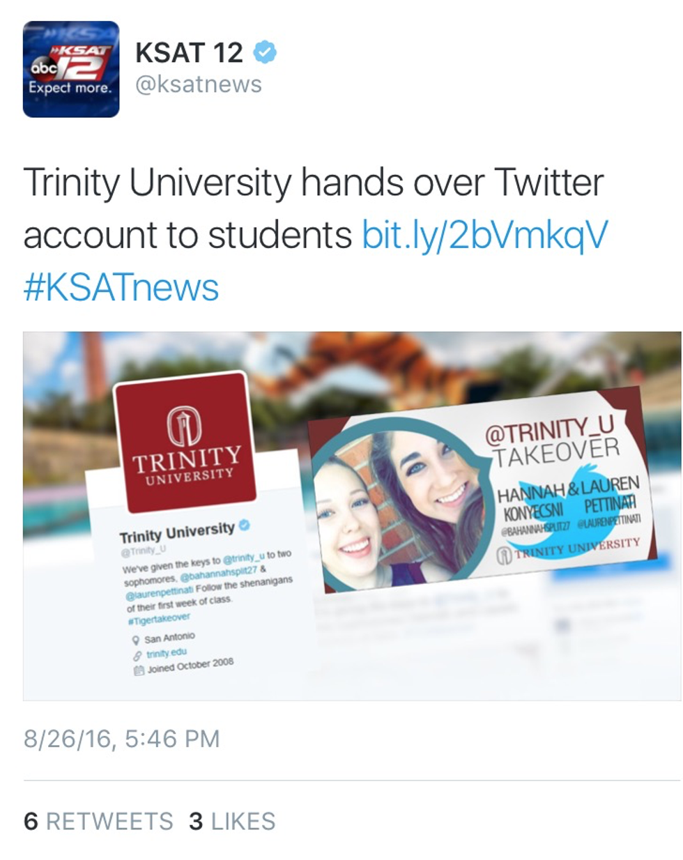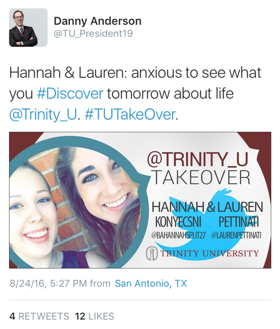 When I was told I was going to be tweeting as Trinity University, I didn’t think much would come out of it. Honestly, I thought people would think it was hacked. I didn’t think that the fact that it was Lauren and I would be so heavily advertised. I was very, very wrong. Even Trinity’s President, Danny Anderson had something to say about it.
