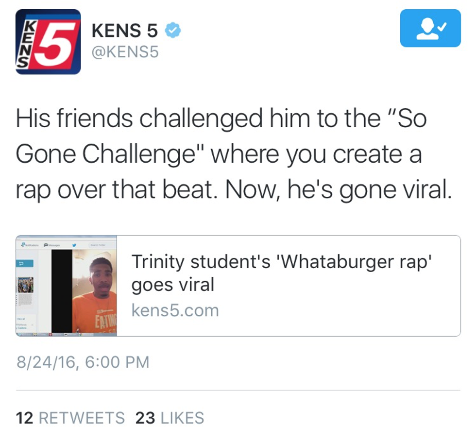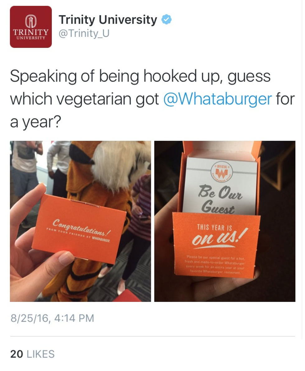 On Thursday, I used the power of having a verified account to my advantage. While our Twitter madness was just getting started, fellow sophomore Isaiah Speck’s had been blowing up for days. He wrote and performed the infamous “Whataburger vs In-N-Out” rap as part of the #SoGoneChallenge and it quickly spread like wildfire. Isaiah made it onto the news and even gained attention from the almighty Whataburger itself. I couldn’t just ignore this, obviously! Trinity jokingly requested burgers in exchange for Isaiah and Whataburger heard the call. Around 1:30, Whataburger’s Social Media Team and mascot was front and center in Trinity’s Admissions. They surprised Isaiah, handed out burger vouchers, and ya girl got Whataburger for a year for getting their attention. Super cool, but I was late to my first 2:10 of the year. Sorry, prof.