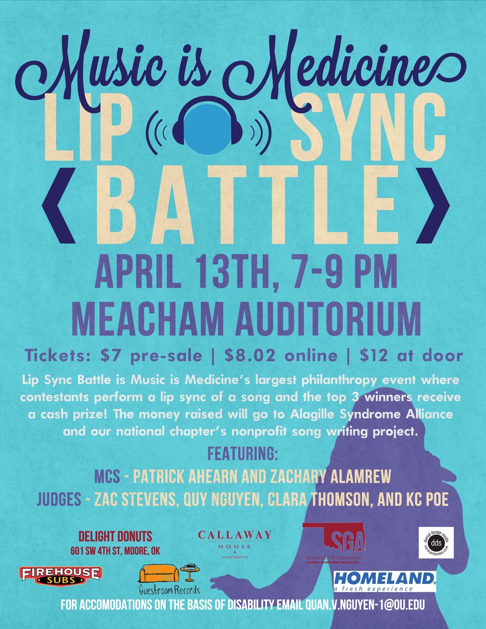 The Music is Medicine chapter at the University of Oklahoma is holding a Lip Sync Battle in the Meacham Auditorium at 7:00 p.m. on April 13th, 2017. This is the second annual lip sync battle, and it is the organization’s favorite fundraiser to acquire the means to help relieve patients’ suffering. Lip Sync Battles were an idea that sprang up during Late Nights with Jimmy Fallon in 2014, and Music is Medicine was inspired to use that idea to help patients.