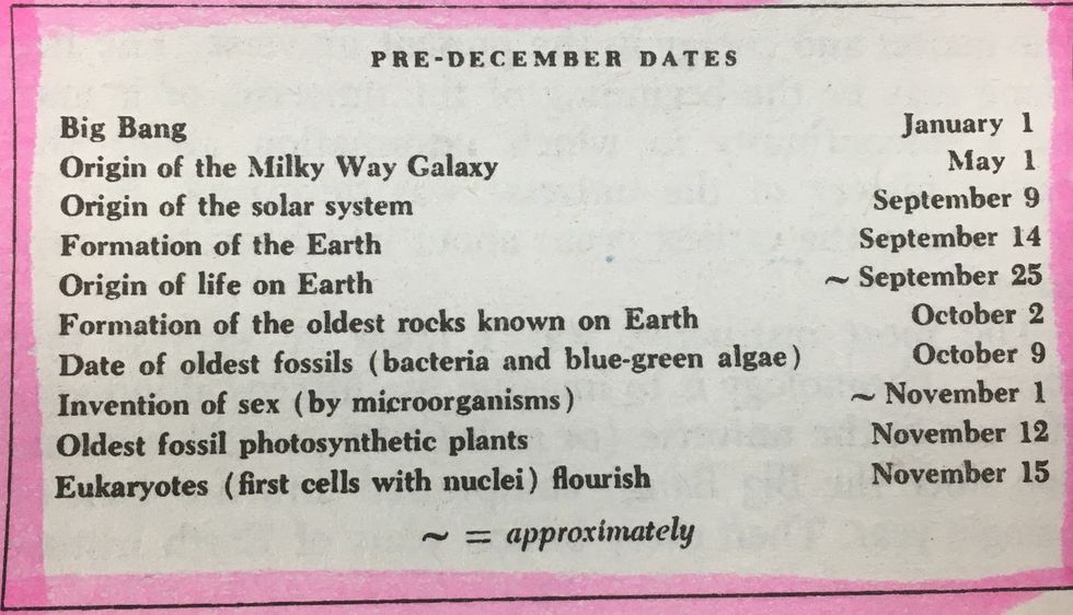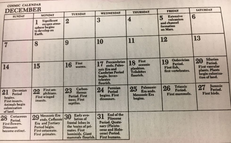 We have 365 days in a year. Sagan was able to establish specific dates that major events would have occurred. Take a look below to see everything that happened for the first 11 months.