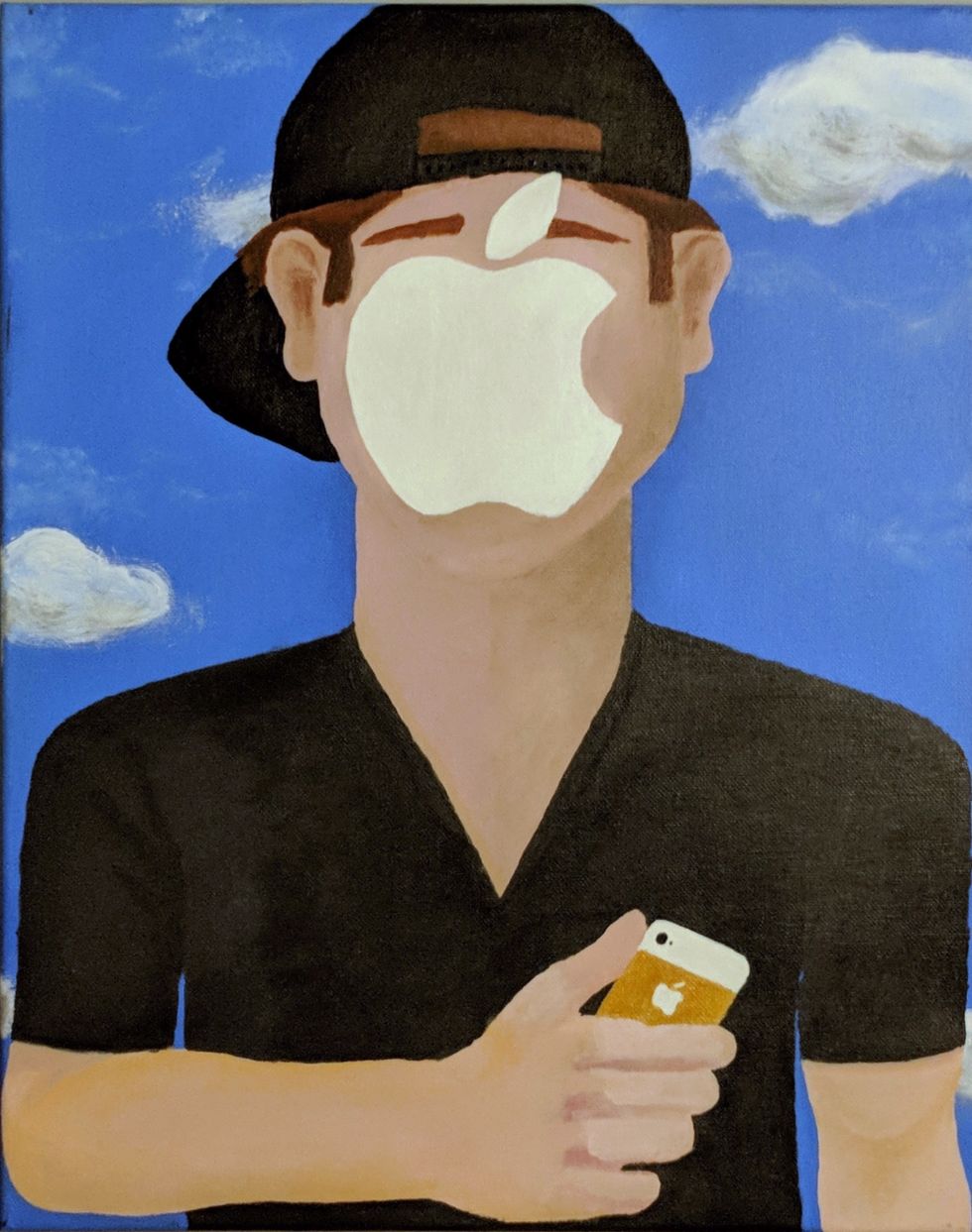 This is a parody of Rene Magritte's famous 'Son of Man' painting. Proportions are off, but I still like it.