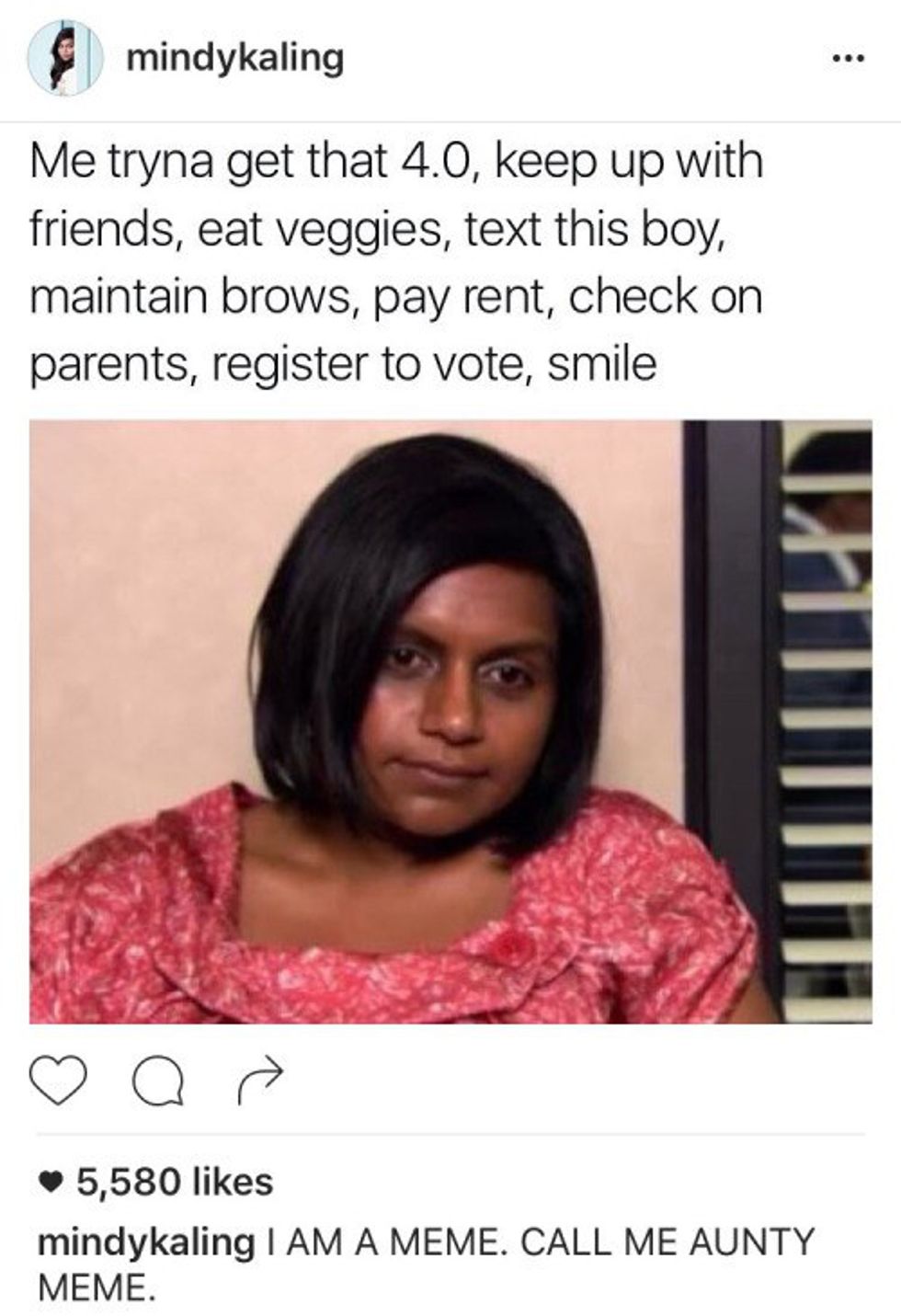 I also believe that while in college you either lose weight or gain it, but trying to stay fit is a while different story. It is easier to grab fast food after class than to meal prep or come back and cook something healthy. Going to the gym can also prove to be difficult when you try to make at least an hour of exercise a day a priority on top of your already busy schedule. When I actually do get a chance to workout three times a week I feel like i am on top of the world but also like I forgot to do something since I had that much extra time. While maintaing a fit lifestyle and keeping up on beauty and self care can be stressful it is important to not let yourself go because your future self will thank you. From writing a paper, to planning out a cute date with your boyfriend, and making it in time for your yoga class, it is obvious that college students are pros at balancing life and somehow making it all work out in the end. No we are not perfect, but we sure have learned a thing or two about time management and prioritizing. While our posts may show the fun times we have, do not judge us because we are not showing you the weekly all-nighters we do, or the moments we are over stressed. We all have 24 hours in the day and it is up to us to use it to its full potential. When you start to feel stressed on Tuesday night, just look at the meme of Mindy's face and realize you are not the only one feeling this way and when we graduate this will be something we will laugh about.