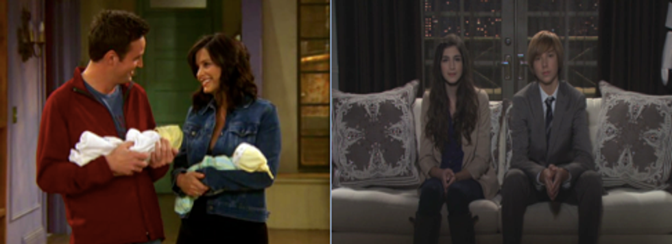 Robin finds out she can never have kids (her imaginary children pictured above,) and Chandler and Monica decide to adopt after being told they won’t be able to have kids.