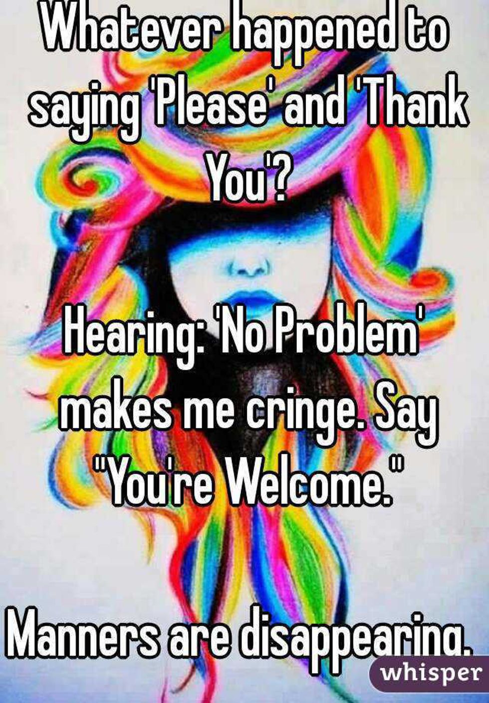 Recently, one of my teachers at school was slightly offended when I replied to her thanking me with an informal," oh, it was no problem at all!" She informed that the manner by which I responded to her was actually rude, and I should have learnt to say "You're welcome" as a response. I was shocked by her comments, since I never imagined what I said could be taken with such offense. Later, I noticed the way different people responded to someone thanking them. Those belonging to the mid twentieth century, or the baby boomers, grew up saying "you are welcome", since they want to the person thanking them that they appreciate the thanks. However, those born from the 80's to the 2000's reply with a quick "No problem" since their mentality is to let the person thanking them know that what they were asked to do was absolutely no problem at all.