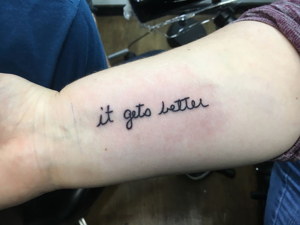 So there it is, the story of what happened to me. Something that I would not wish on my worst enemy. I hope that this can help someone. No matter what you are going through, it gets better. As I've been going through, this my mom has continuously reminded me of this. I decided to get it tattooed on my arm, to always remind me that I can get through it with all the support and love from those around me. No, I am not completely better yet, but I know that the only way up from here is up. I know that my friends and family will support me and continue to give me reasons to be happy every day. Each day I wake up with a little more hope and feeling a little closer to being back to normal. I wake up each day looking forward to living another day that God has blessed me with. I wake up knowing that I am loved and that I AM ALIVE.