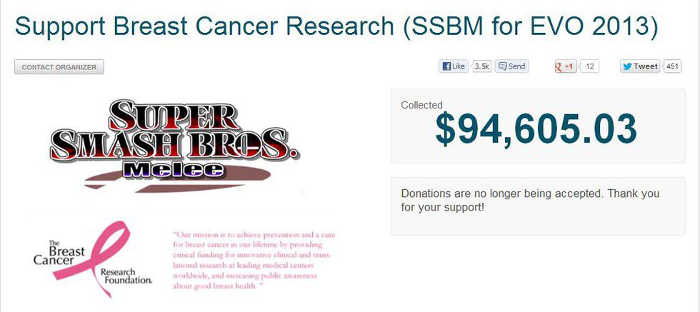 The greatest highlight of the Melee communities dedication was demonstrated during Evolution 2013s charity drive. Evolution's tournament organizers wanted to hold a charity drive in order to determine the final game for its lineup. The race came down to Melee and Skullgirls. Ultimately, Melee conquered by raising over $94,000 for Breast Cancer Awareness (polygon). As always, the community had to fend of yet another threat. Nintendo forced Evolution to not stream Melee during their event. Through a concentrated effort of social media bombardment, Nintendo revoked these statements within a few hours. Time and time again the Melee community has been able to persevere and grow despite all of these obstacles. Everyone's love and support for the game has kept Melee's flame alive for nearly 15 years.