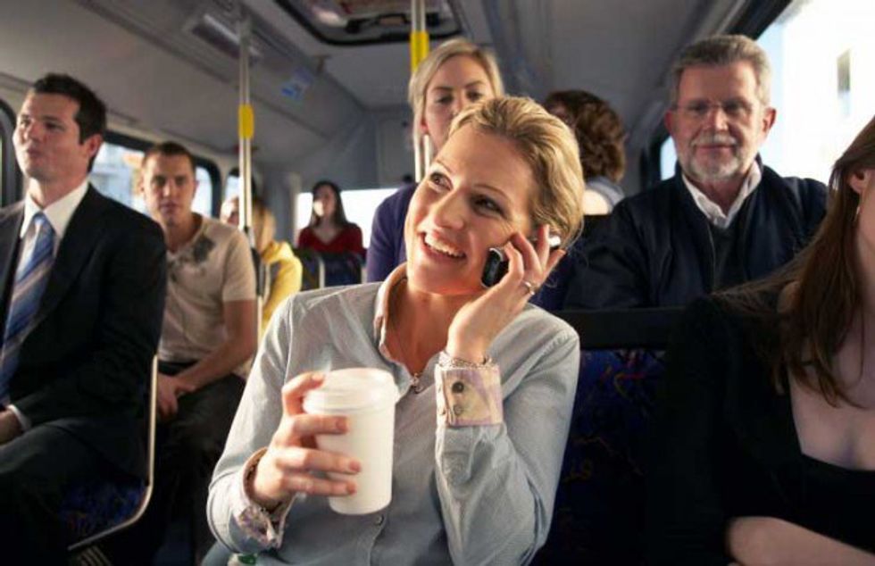 You couldn't wait till getting off the bus to call your husband? It's kind of annoying when I can hear you discussing your child's daycare over my music. In a crowded environment it's best to minimize conversation.