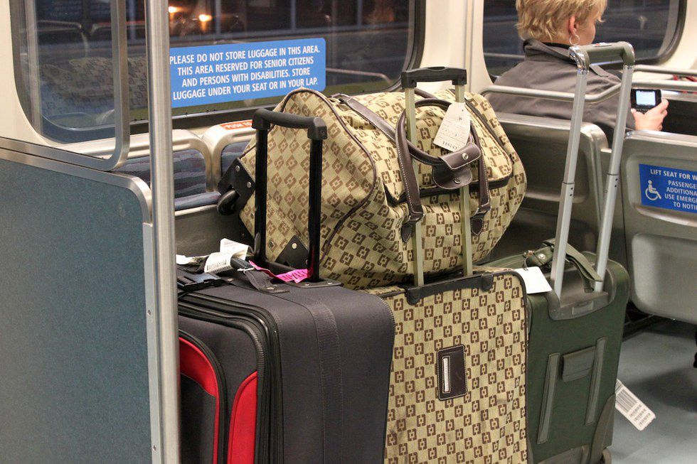 It's really annoying to have someone carrying all their personal belongings on. Your absurd amount of bags takes up space for someone else to get on and bump into us every time you move around. If you really have that much stuff to carry, call an Uber.