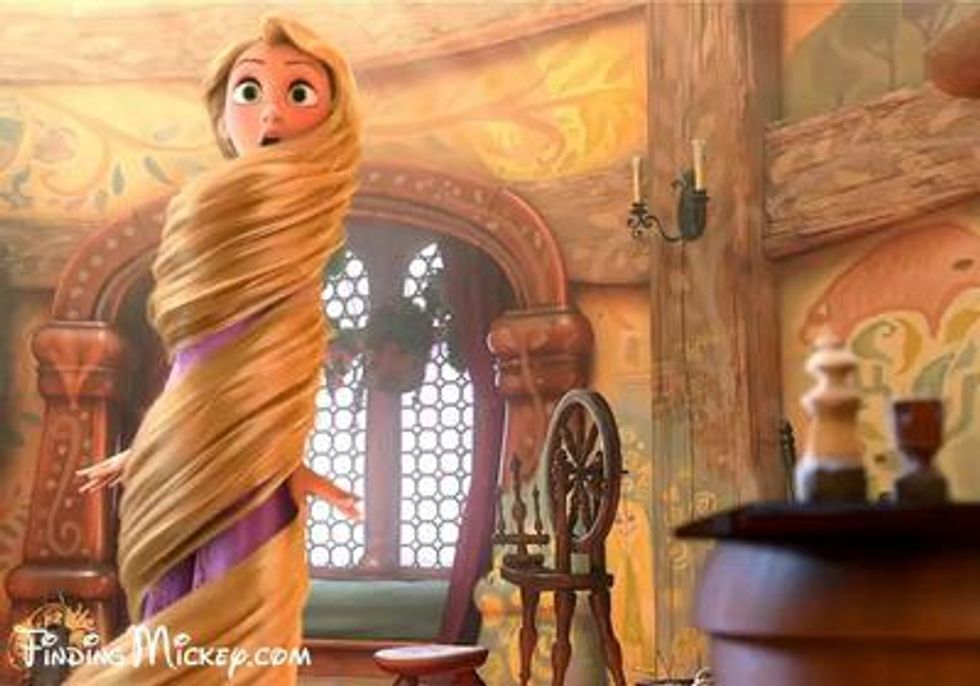 The three-legged spinning wheel from "Sleep Beauty" appears in Rapunzel's room.