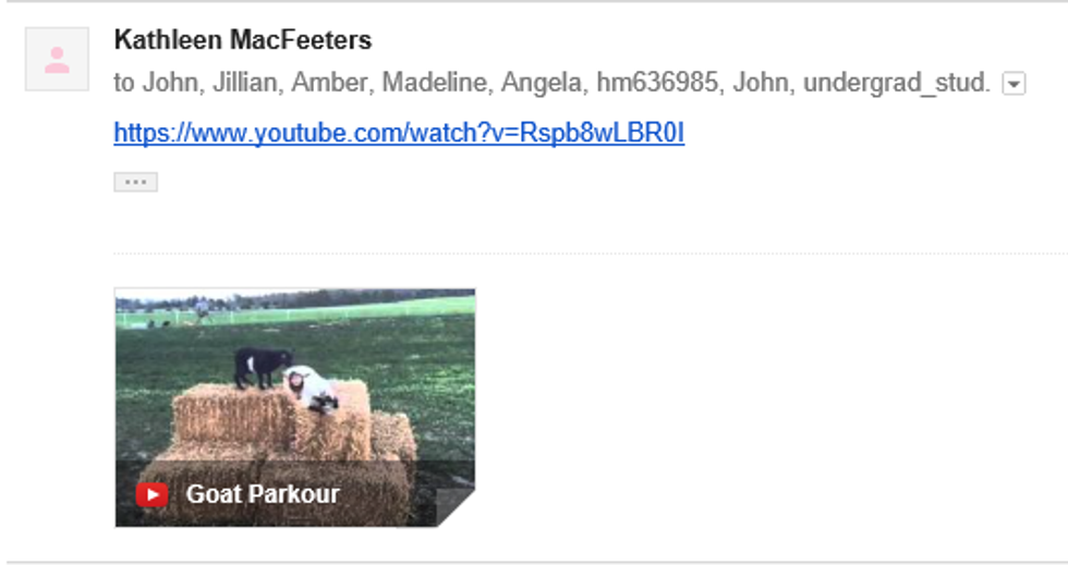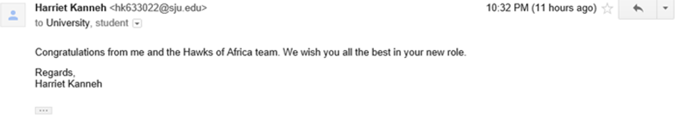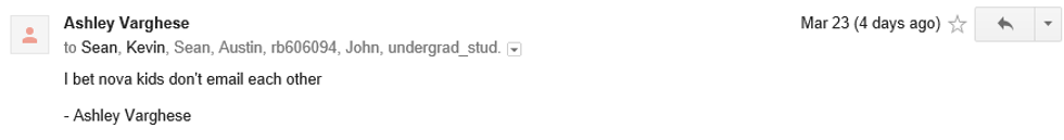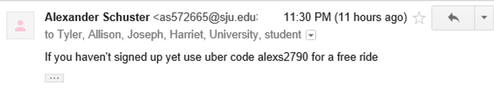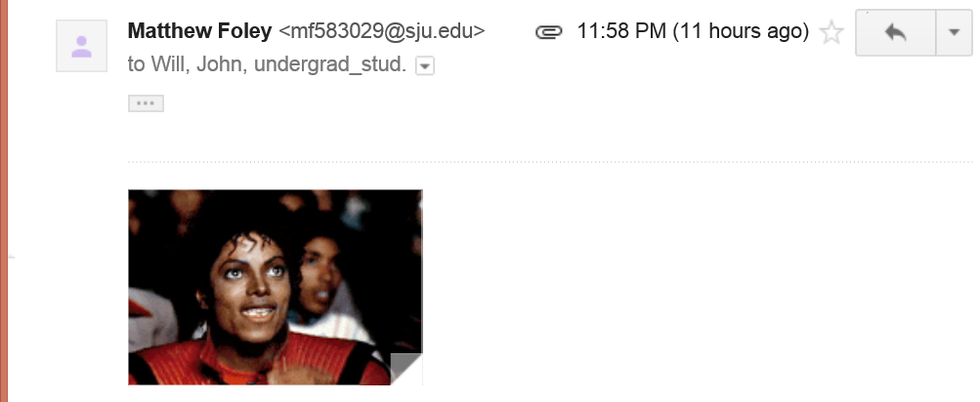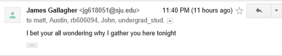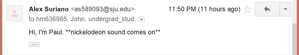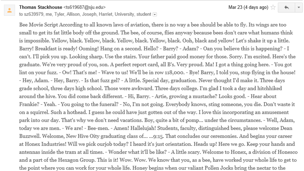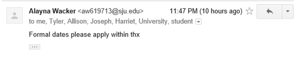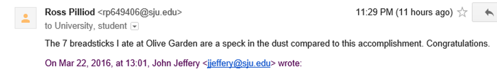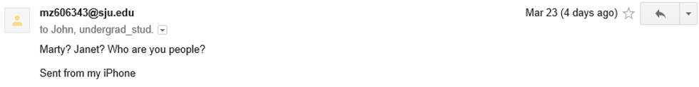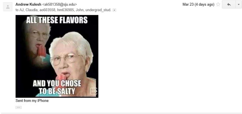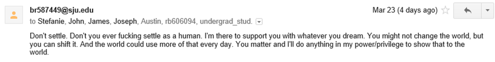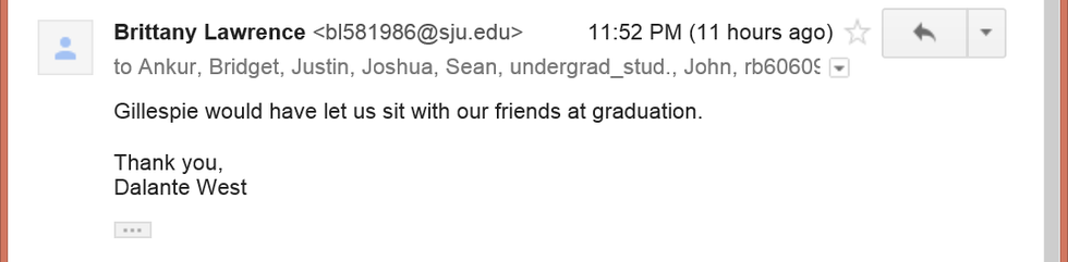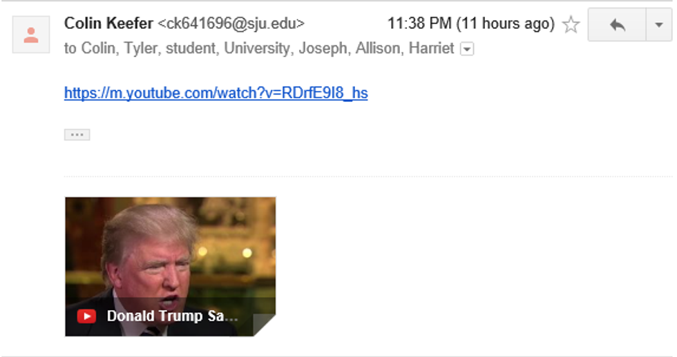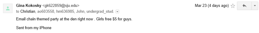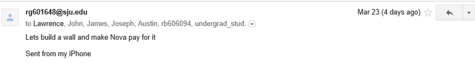 So, although my phone email app frozen and kept buzzing all night, thanks to the SJU student body for making me laugh, making me smile, and giving me a video of Donald Trump saying "China" to show my family this Easter break. Peace. Love. Chain Emails.