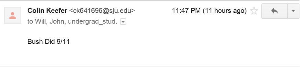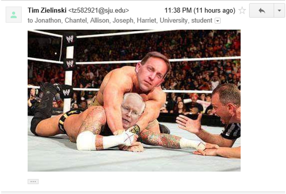 Well, let me just say that last night was definitely an experience for the entire SJU community. No, I’m not talking about the Pope’s visit or Kobe Bryant at Larry’s or even our recent A-10 basketball championship. I’m talking about the email chain on the Provost and Student Life Awards emails.