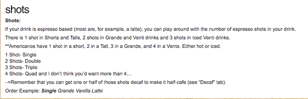 This is possibly the most important step of all. This step will help you be confident in your ordering abilities even on those impromptu Starbucks trips, and keep the barista from hating you. Here is a break down of what you need to know: