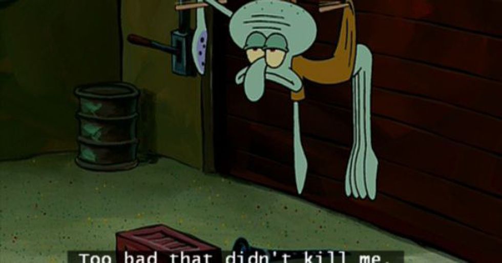 I'm not suicidal and don't often think about this Squidward relation but this is something some people can relate at times. An example is when you get a long list of assignments to do for a certain class especially at the end of the semester, you say something or think something like this regardless if you're suicidal or not.