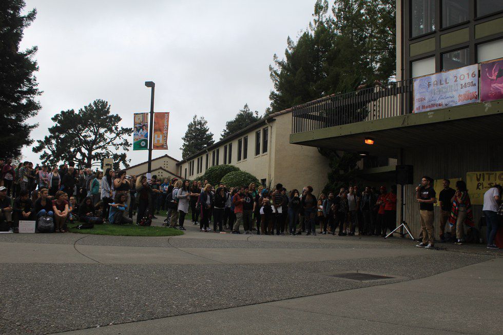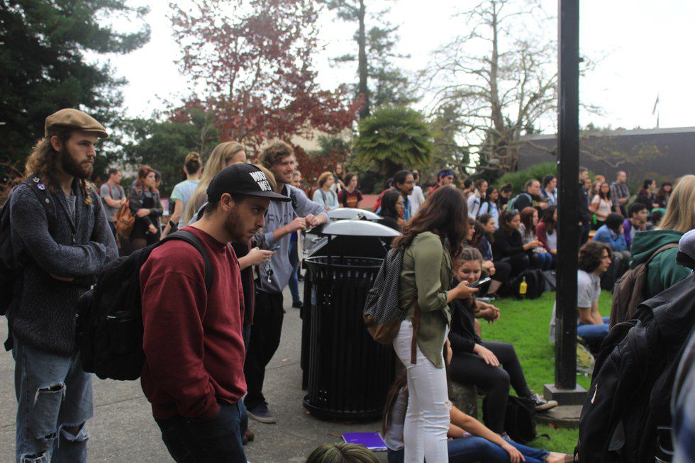 Students in the quad listening to the public speech being held on November 9th.