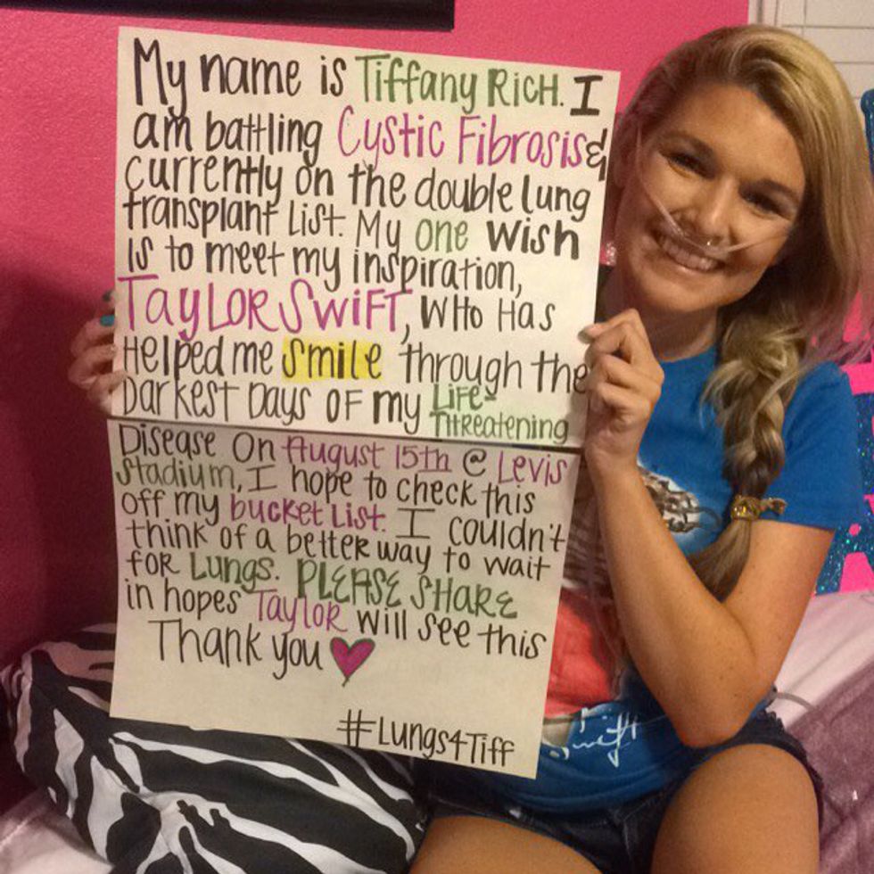Rewind to two weeks before, July 30, 2015. My best friend Kelsey and I had been waiting for the 1989 tour to come to Santa Clara since December. Taylor has always been someone that we turned to when times got rough. For Kelsey it was an intense break up and for me it was my life-threatening disease called cystic fibrosis. Taylor has always brought me so much joy, whether it was through her music or just how much of a caring and genuine person she is. In the hospital you can hear me rocking out to her albums to get me through the boring and bad days. Since she has made such a positive impact on my life, I knew I had to meet her and I would have to make it happen. That night, I told Kelsey that we need to write my story on a poster and take a picture of it with me since my story wouldn’t fit in 140 twitter characters. So, we put together a poster and took a picture of me with her poster on my wall with my “Speak Now” concert tee shirt on. We started with Snapchat and told people to screen shot and share it. Then we took to twitter where we tweeted at our favorite Bravo-lebrities. A few seconds later, they retweeted my post. Kelsey and I were literally crying on my bedroom floor. We posted it on Instagram and Twitter all with the hashtag, #LUNGS4TIFF. This campaign to get Taylor’s attention went viral. We both were getting so many notifications that we had to turn them off to sleep. I even went over my data limit by a bunch this month. My post went viral to the point that NBC Bay Area news found me and did a story for the 5 and 6 o’clock news. It ended up running many more times after that. We didn’t know that this was going to get more attention than that. Before we knew it, we were getting stories on our local Patch and other online news providers.