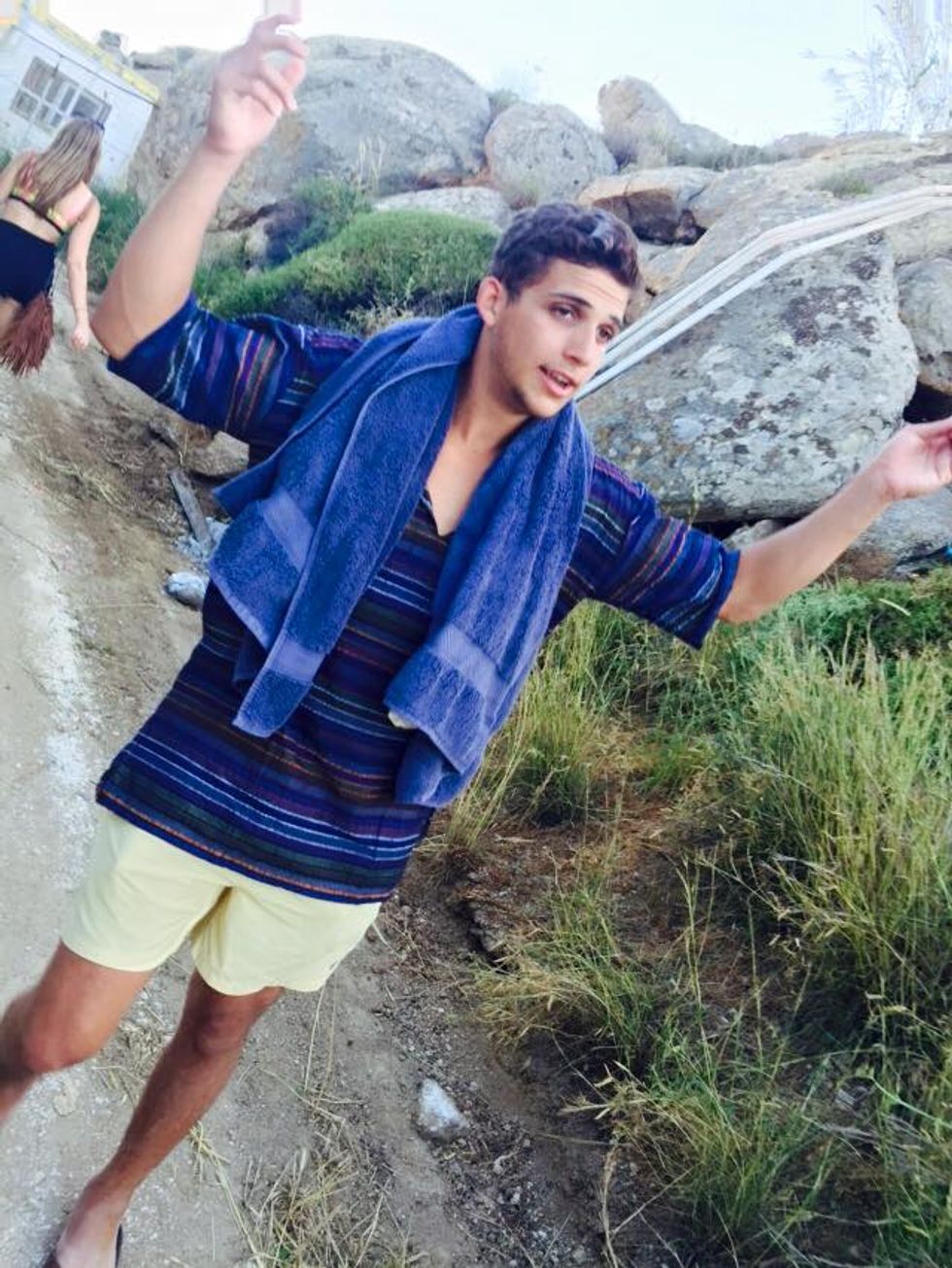 Dean is wearing a shirt from somewhere in the Middle East (because, in his own words, he's “cultured”), Polo Ralph Lauren swim trunks, and Reef flip-flops.