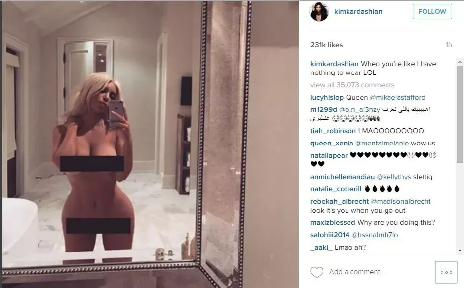 This was the case with the recent Instagram photo Kim Kardashian posted. As I do not follow her on Instagram, I did not see the photo until it was all over my Twitter feed. I was bombarded with women and men, fans and non-fans, calling her a whore amongst other things. The image (shown below) shows Kim Kardashian in the nude with her boobs and genitals blurred out with the caption, "When you’re like I have nothing to wear LOL."