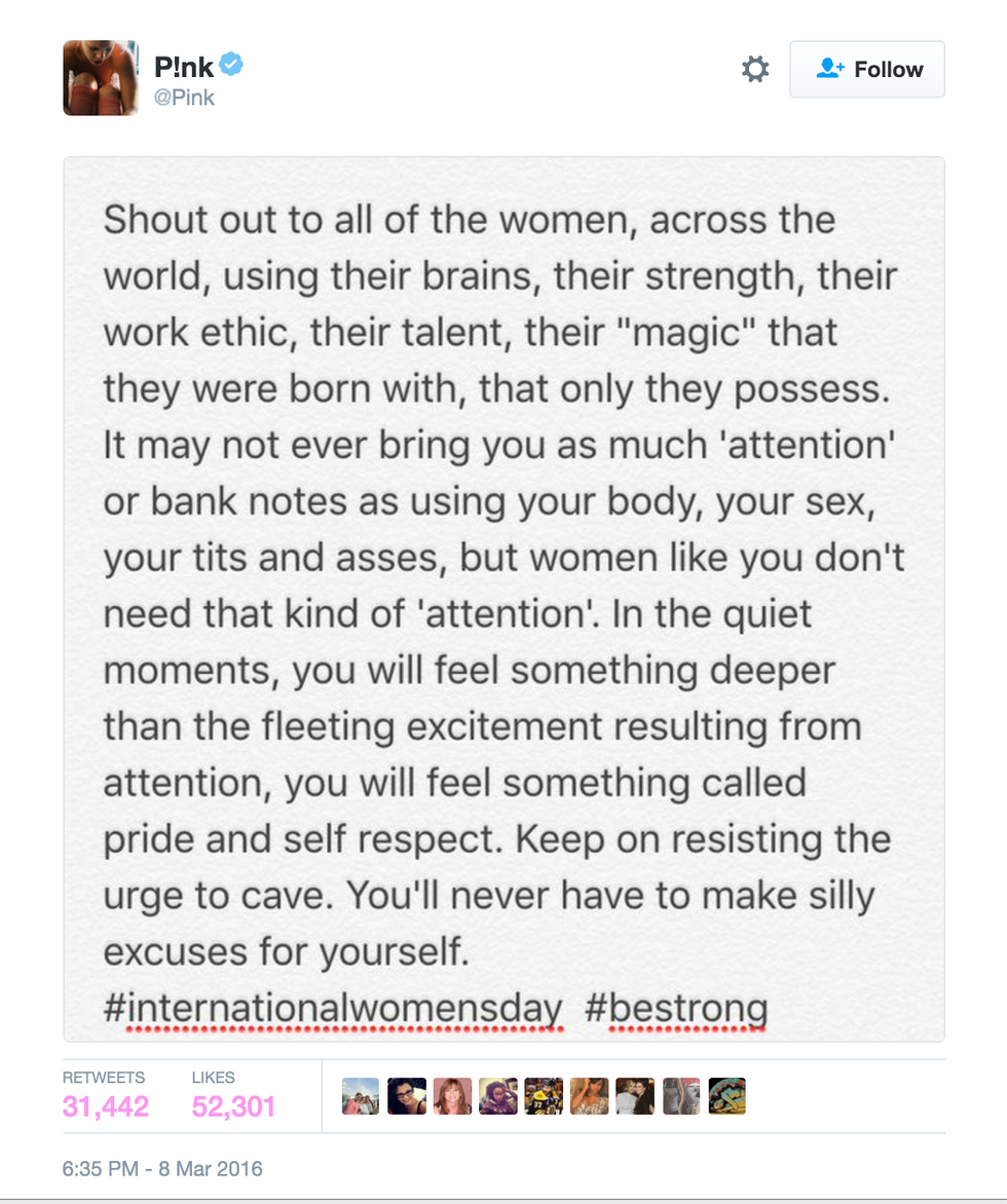 The female body is treated as something to be hidden from outsiders. If, however, the woman decides to show her body, as Kim K did, she is labeled a whore. Whether it be posting a blurred out nude on the Internet, or posting a photo of a mother breastfeeding with slight nipple exposure, the woman gets labeled. Furthermore, the idea that Pink perpetuated that a woman can't both be known for her brains and display her body is severely misguided and wrong. Yet, it is OK for Payne or Bieber to be known for their body and their talents. We should instead strive to teach young girls that their body is not something to be ashamed of. While I do not think 12-year-olds should be posting blurred nudes like Kim K did, I do not think their body is something they should grow up being told to be ashamed of.