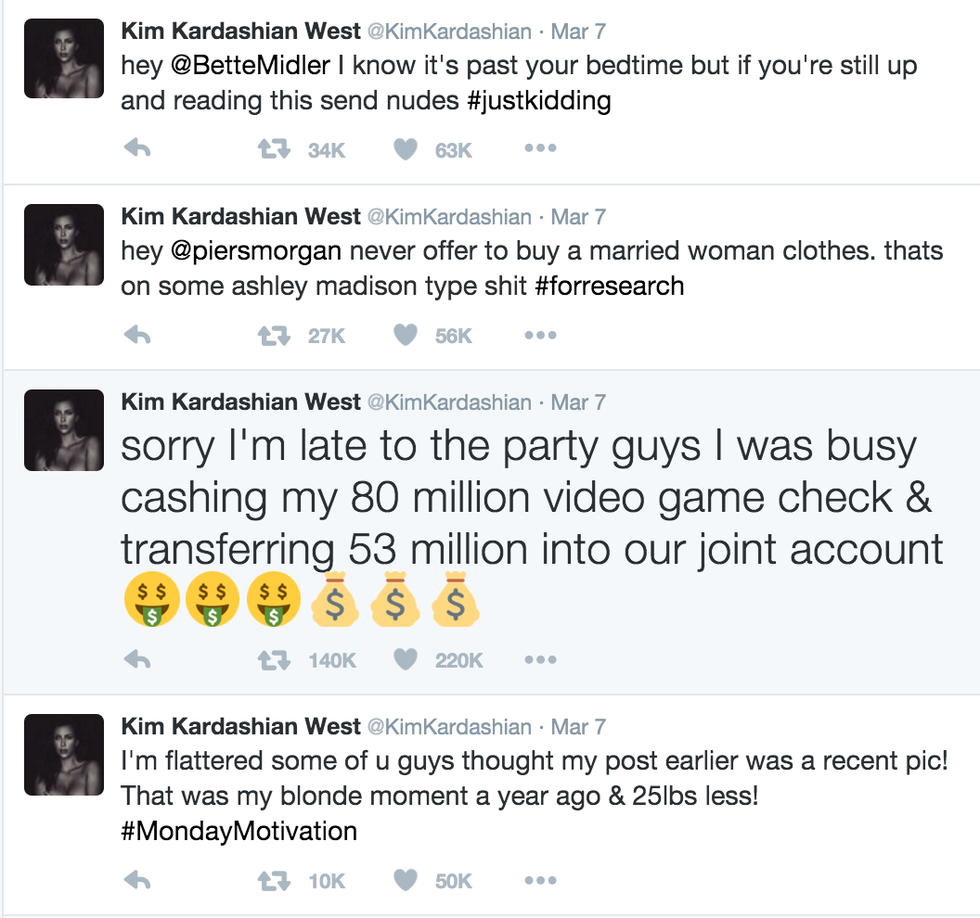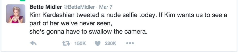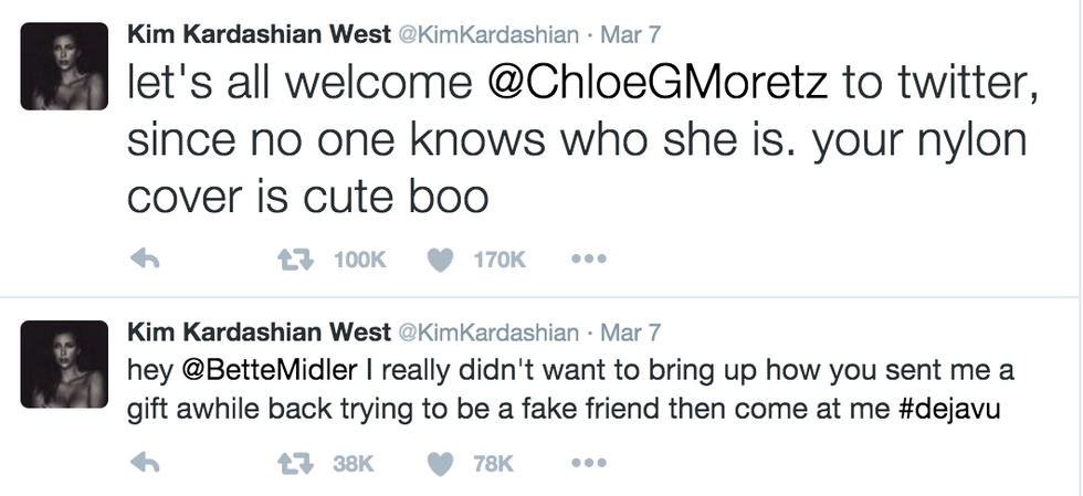 Amongst the many who tweeted backlash at her were Chloe Grace Moretz, Pink and Bette Midler, to which Kim K responded to each of them in their own respective tweet. The tweets sent to her (shown below) mentioned how Kim needs to cover up and use her brains instead of her body to further herself in Hollywood. Bette Midler even referenced Kim’s sex tape that went viral in 2007, regardless of it being filmed in 2003 without the intention of it being leaked.