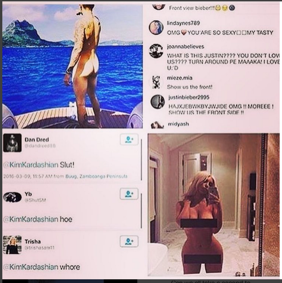 So, why does this matter? Since the backlash at Kim started, many feminists have posted on several social media sites the differences in the way the female body is treated when photographed in the nude versus the male body photographed in the nude. These images included photos from Justin Bieber and Liam Payne (shown below).