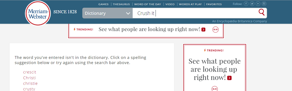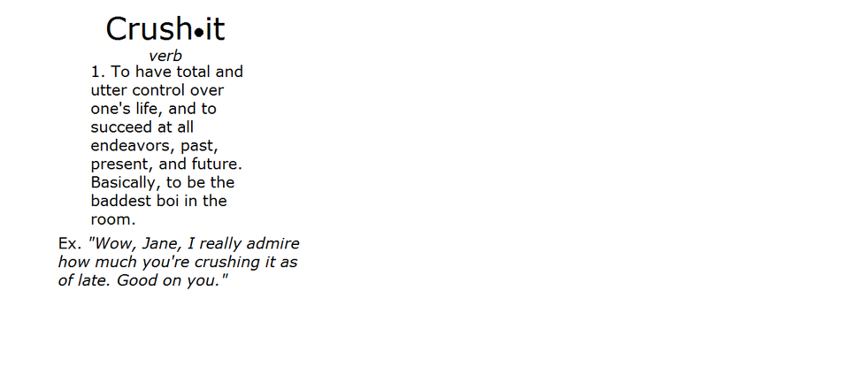 Now, you may be asking yourself: "What is crushing it? It sounds pretty cool to me. How can I set about doing it?" In which case I would tell you to "Slow down, Eager McBeaver." To accurately explain what "Crushing it" is, I consulted the dictionary. Since it's the twenty-first century, I expected to find the definition right away, but-