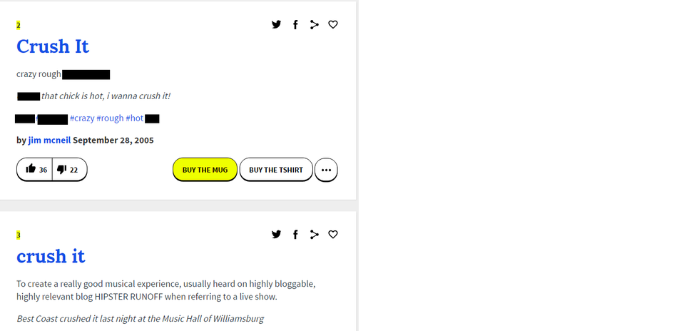 Nothing. Obviously, the hacks over at Merriam-Webster aren't quite as interested in "crushing it" as you and I, and it shows. No matter. Being the internet-savvy guy I am, I decided to go prowling about the "deep web" and go to the most underground place I could find-Urban Dictionary. A few definitions for "crushing it" came up, all of them incorrect. Or, at least the three I read were.