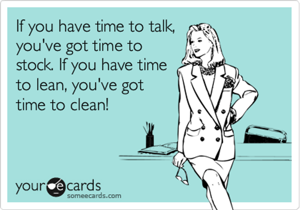 We all lean and talk when we should be stocking and cleaning. It happens, the solution is to make certain it does not happen constantly. I have had individuals come up to tell me their coworkers go wandering off. Disappearing for an hour or so, allegedly having a smoke break or taking the trash out. If your employees do those things or hanging out in a different area, there is a problem that needs to be resolved. You can try talking to the area supervisor to see why he/she is letting her team wonder off. The supervisor may be busy doing a job or the wondering employee(s) lied to their supervisor about ‘getting a drink,” or “taking a smoke break,” again the supervisor may not care. The aim is to stop the wondering employees and get them back to work.