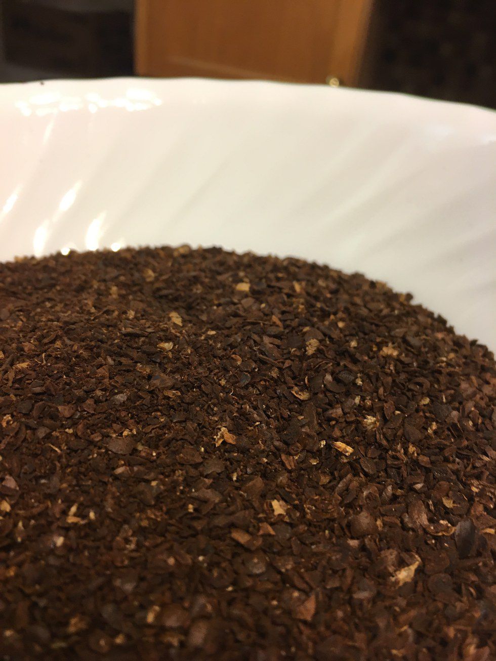 Then I grinding the coffee bean in coarsest setting possible. This is critical for our homemade filter method! Transfer the ground coffee into a bowl. This is what is should look like after.