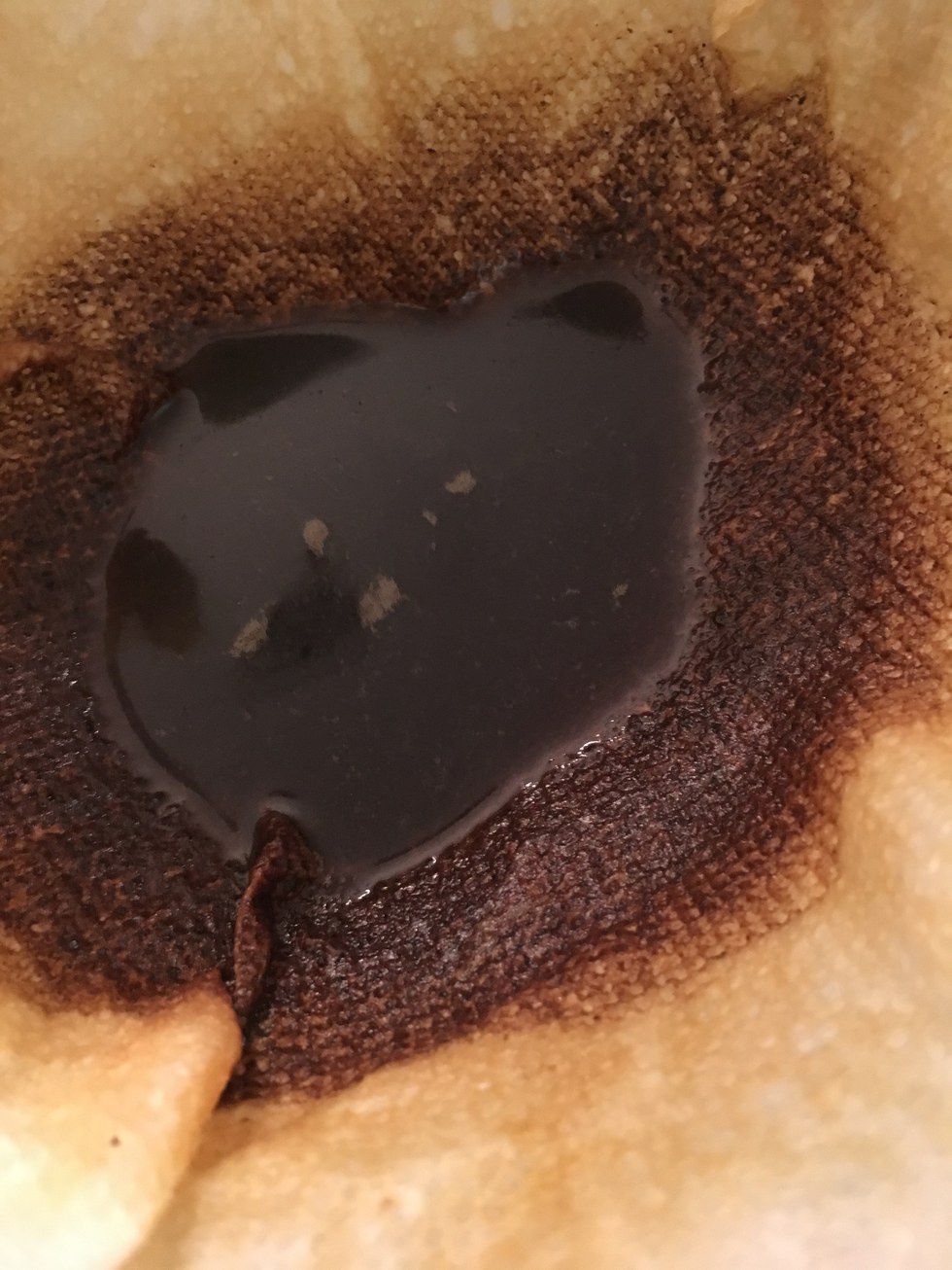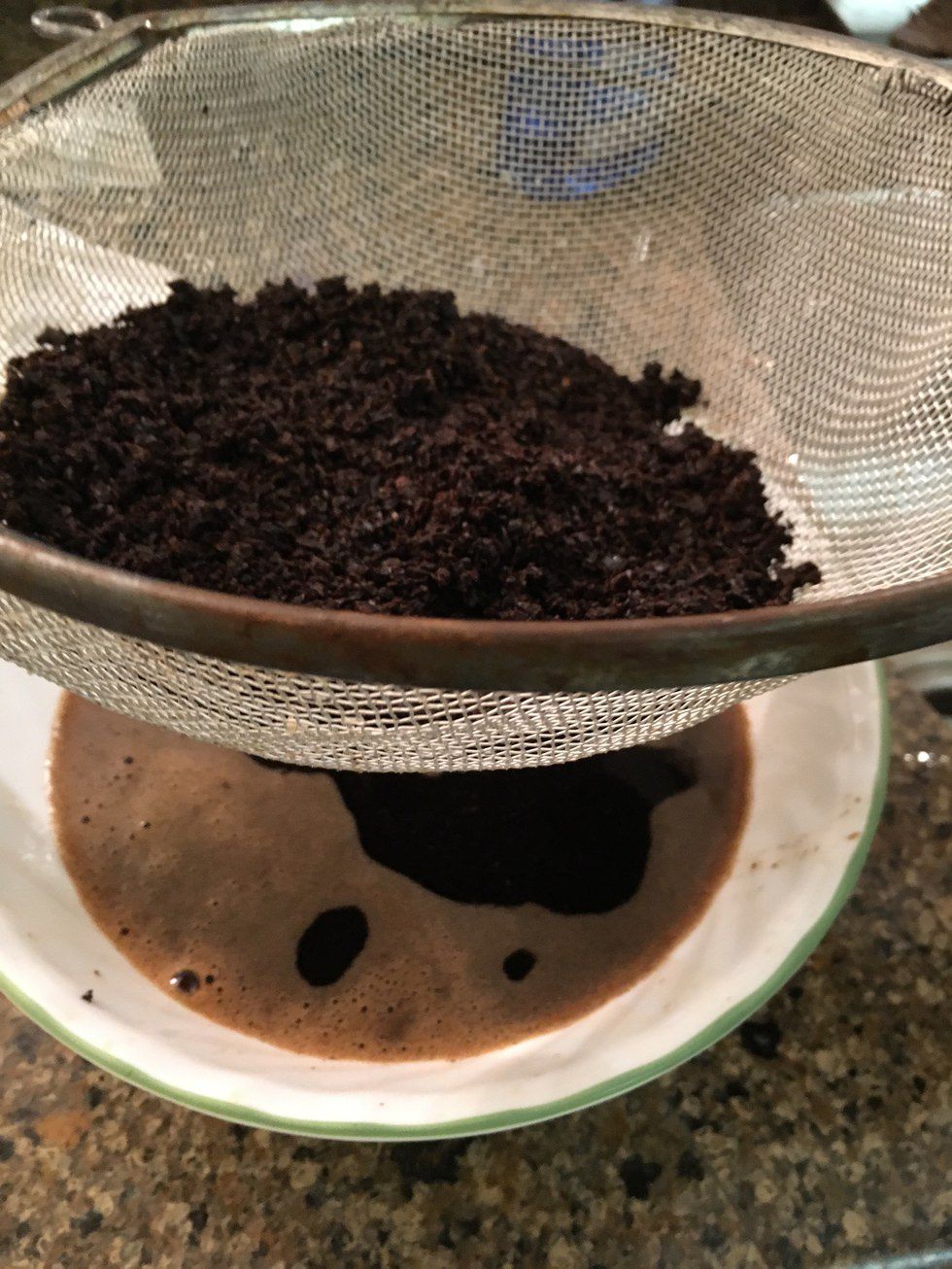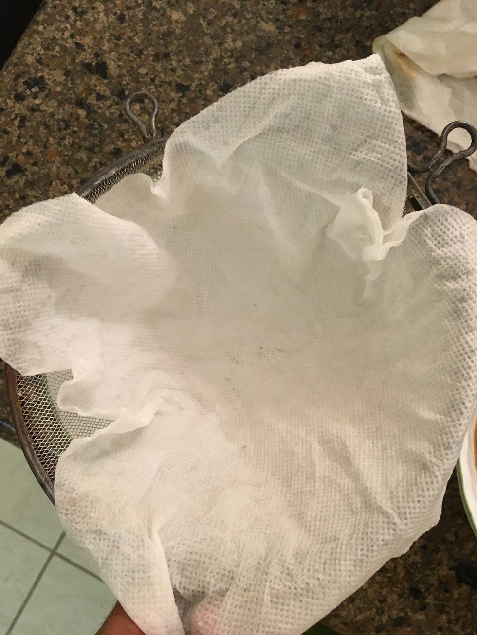 Then, you will want to do another strain. This time to get the smaller coffee bits. All you need is a damp paper towel over your strainer. Then pour your coffee over it.