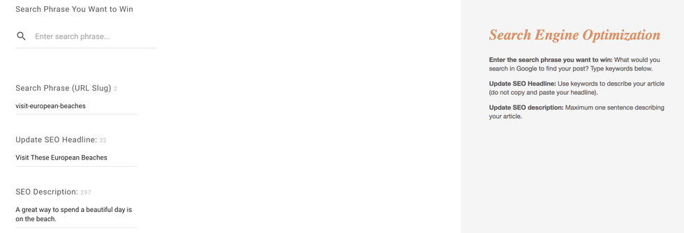 Your SEO headline will show up in Google search. This is not your article headline. It should include keywords you would use if you were actually searching for your article.