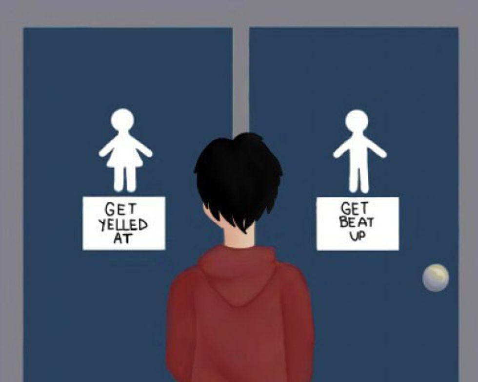 If you said no to the previous question, move to the third: “Which restroom am I less likely to get beat up in?” This does not necessarily mean you should use the women’s restroom. The answer to this question is based on location in both a macro and micro sense. Are you in California? You’re probably good no matter which restroom you choose. If you’re in a the basement of a building that’s home to a militaristic religious group in California, you’re likely not safe no matter what which restroom you choose. Are you surrounded by Trump supporters? Probably not safe no matter what. Are you surrounded by Trump supporters in a MOGAI center in California?... That’s a toss-up; go with your gut on that one.