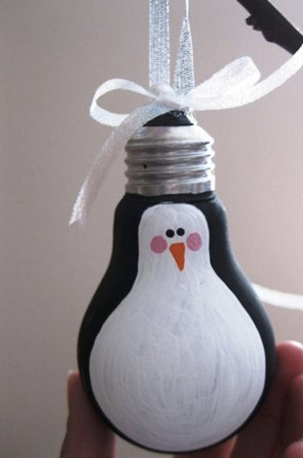 Have some old, fused light bulbs just laying around? Gather your black, white, orange and pink paint to let them transform. Paint them into a penguin and give it a new home on the tree so it can dangle and bedazzle! Add a ribbon to the head of the bulb to stick it onto the tree.
