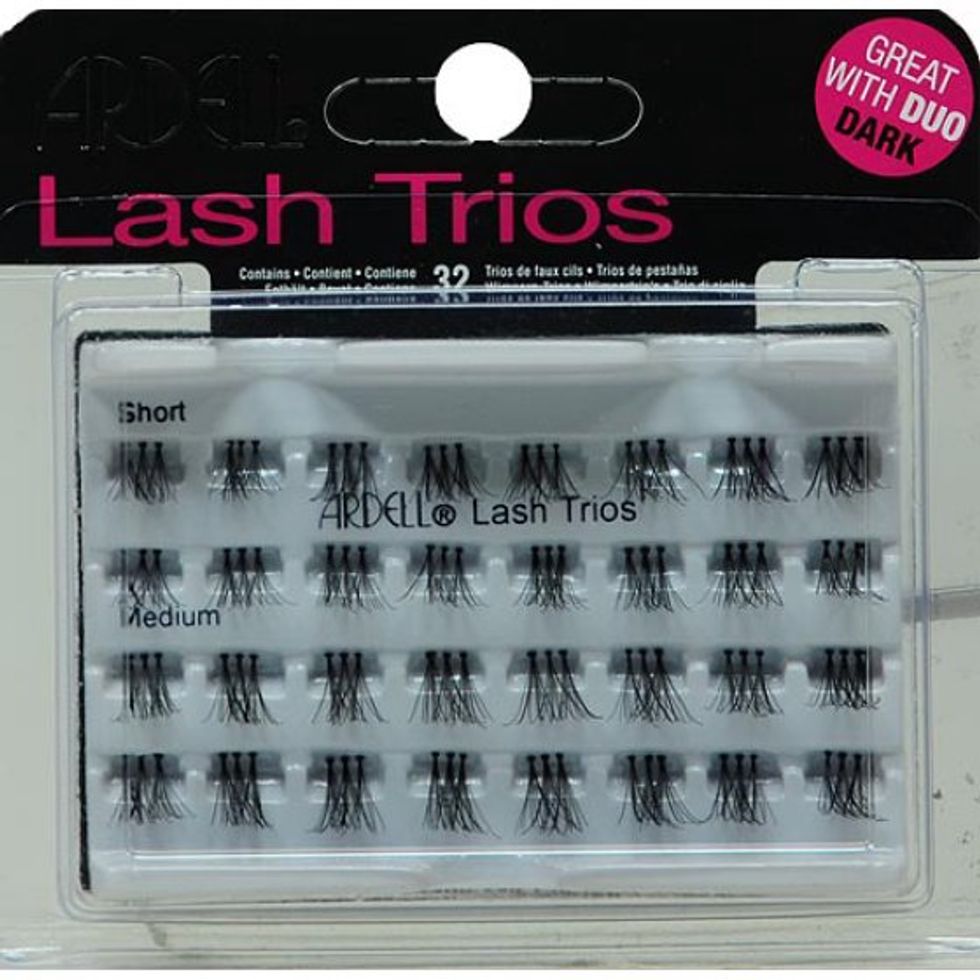 These Ardell individuals are a bit more difficult to put on. They tend to rotate and fall off of your lashes because there isn't much surface area for the glue. The trios work much better because they have more grip and they do not rotate. The individuals are less clunky looking than the trios, but the trios are easier to work with if you're a beginner. They are easier to apply because they are wider. Both the individual and trio lashes look very natural and don't have a thick, black strip that covers your eyeliner.
